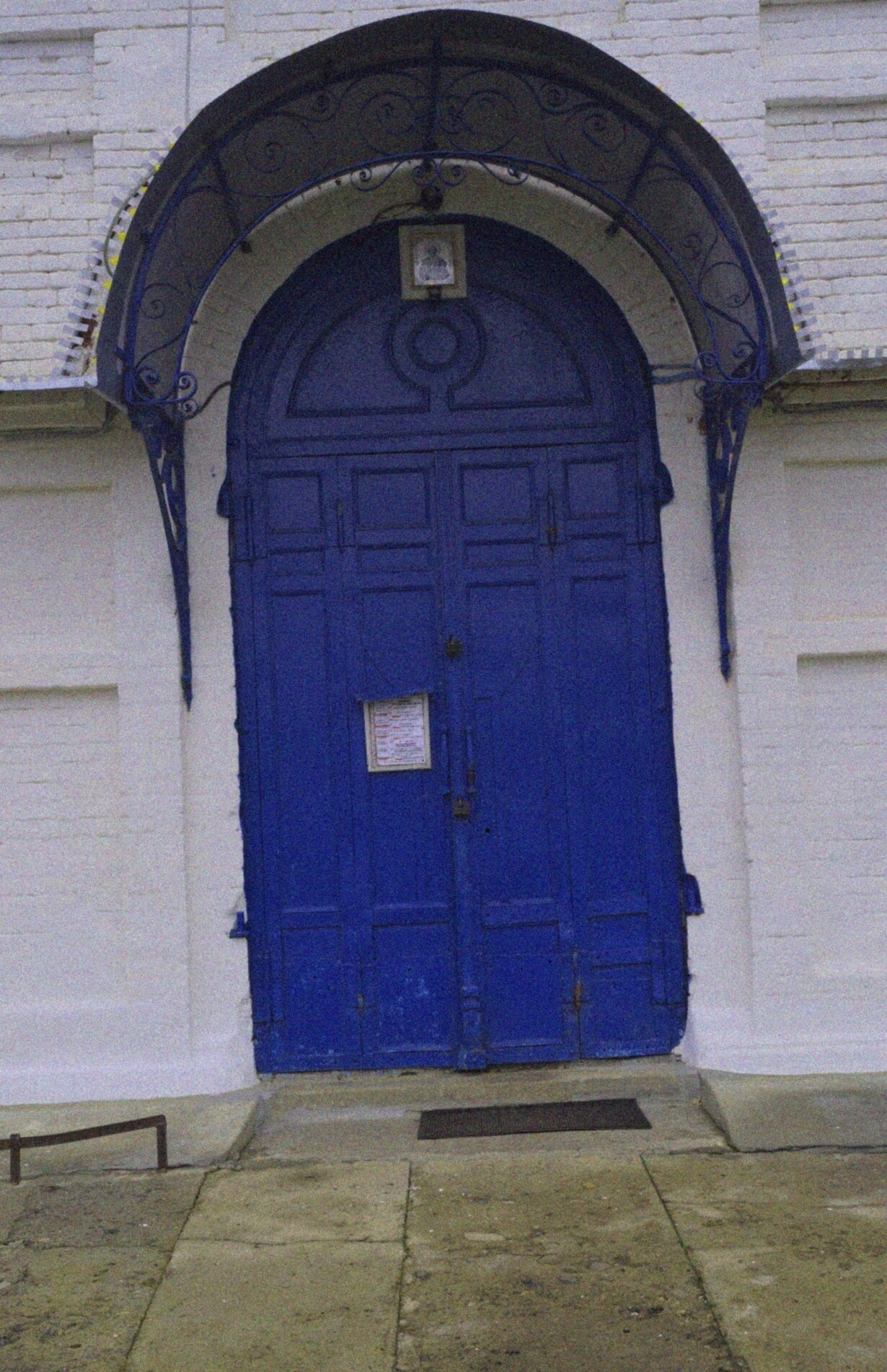 Главный вход храма оформлен массивной двустворчатой дверью синего цвета с арочным завершением, что характерно для традиционного церковного зодчества. Над дверным проемом установлен защитный кованый козырь, под которым размещена икона, предназначенная для молитвенного поклонения верующих перед входом в святыню. Стены церкви выложены из белого кирпича, создающего торжественный и чистый образ.