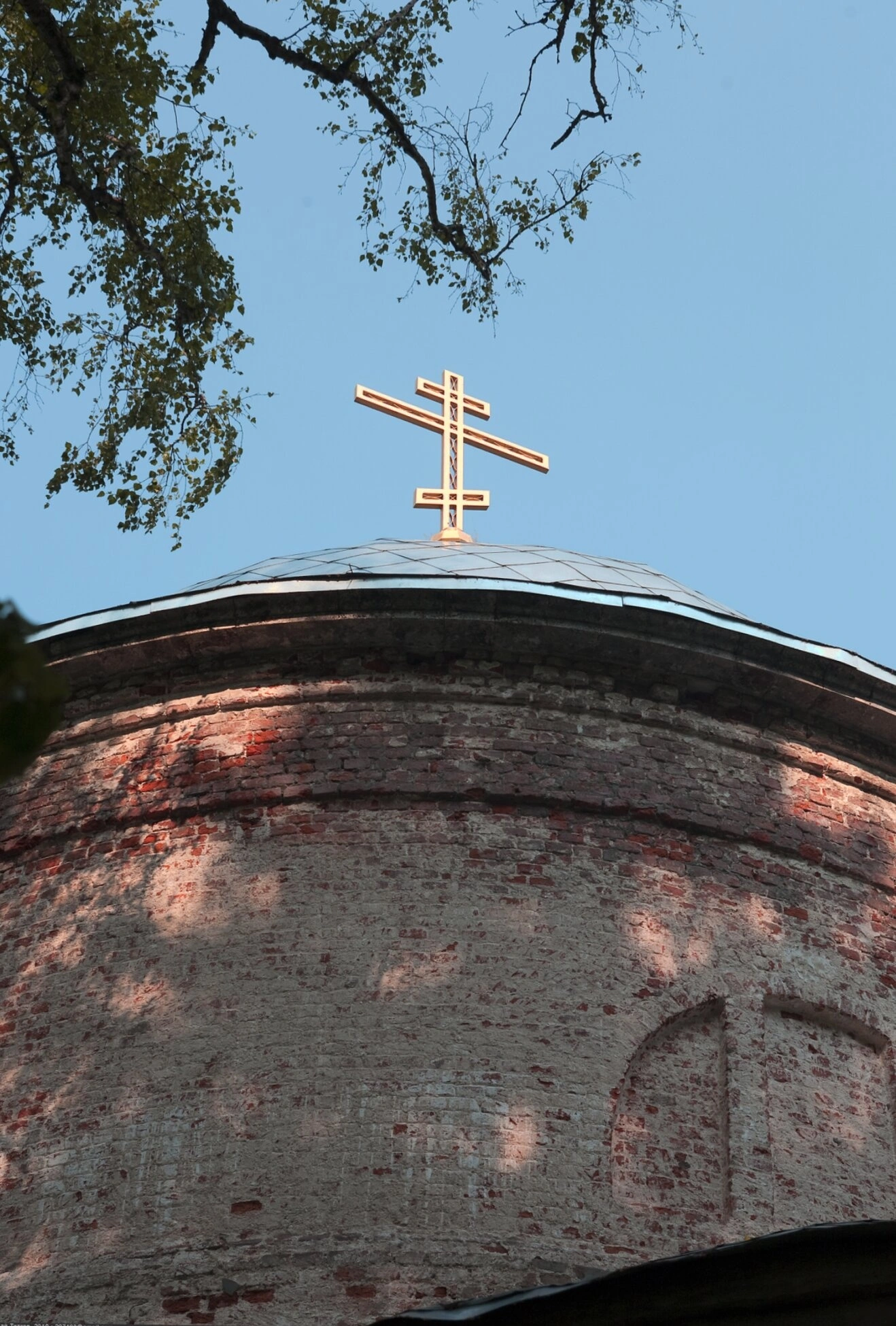 Чётко просматривается искусная кирпичная кладка конца XIX века, выполненная с большим мастерством. Обращают на себя внимание заложенные кирпичом арочные проёмы, что является свидетельством разных этапов в долгой истории святого места. На переднем плане ветви дерева с молодой листвой обрамляют древнюю постройку, подчёркивая её монументальность и органичную связь с окружающей природой.