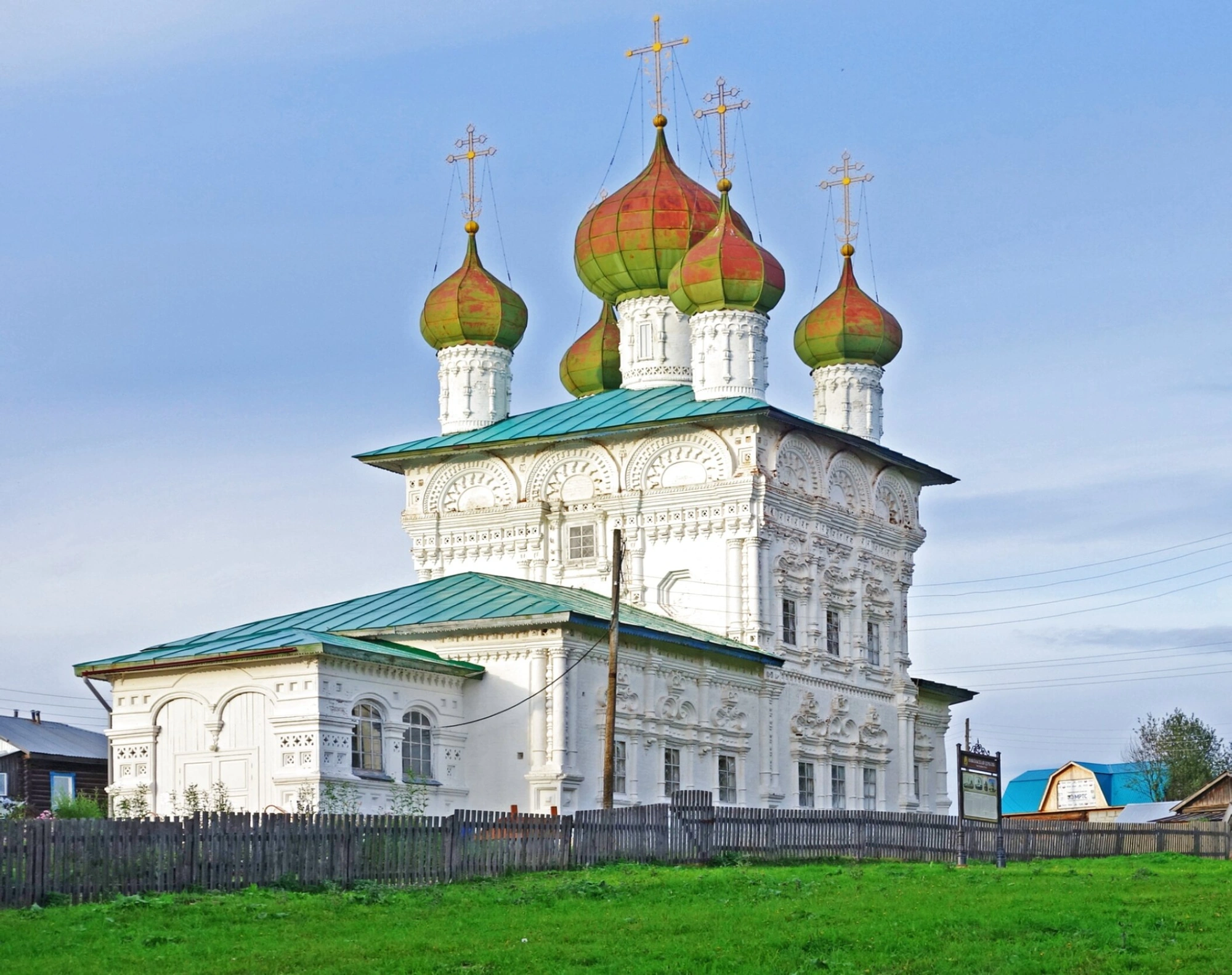 На представленной фотографии запечатлён величественный вид Никольской церкви, расположенной в селе Ныроб Чердынского района Пермского края. Этот православный храм, освящённый во имя святителя Николая Чудотворца, является выдающимся памятником архитектуры конца XVII — начала XVIII веков и объектом культурного наследия федерального значения.