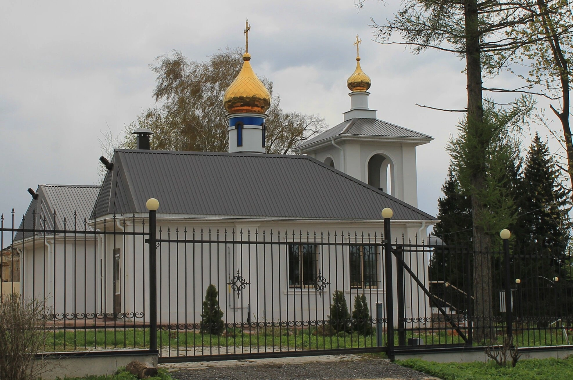 Перед святым местом установлен ажурный кованый забор, за которым виднеются ухоженные хвойные насаждения. На заднем плане открывается вид на живописные окружающие храм древесные массивы, что создаёт ощущение умиротворения и единения с природой. Пасмурное небо на фотографии добавляет кадру особую, созерцательную атмосферу и подчёркивает величавый образ этого духовного центра.