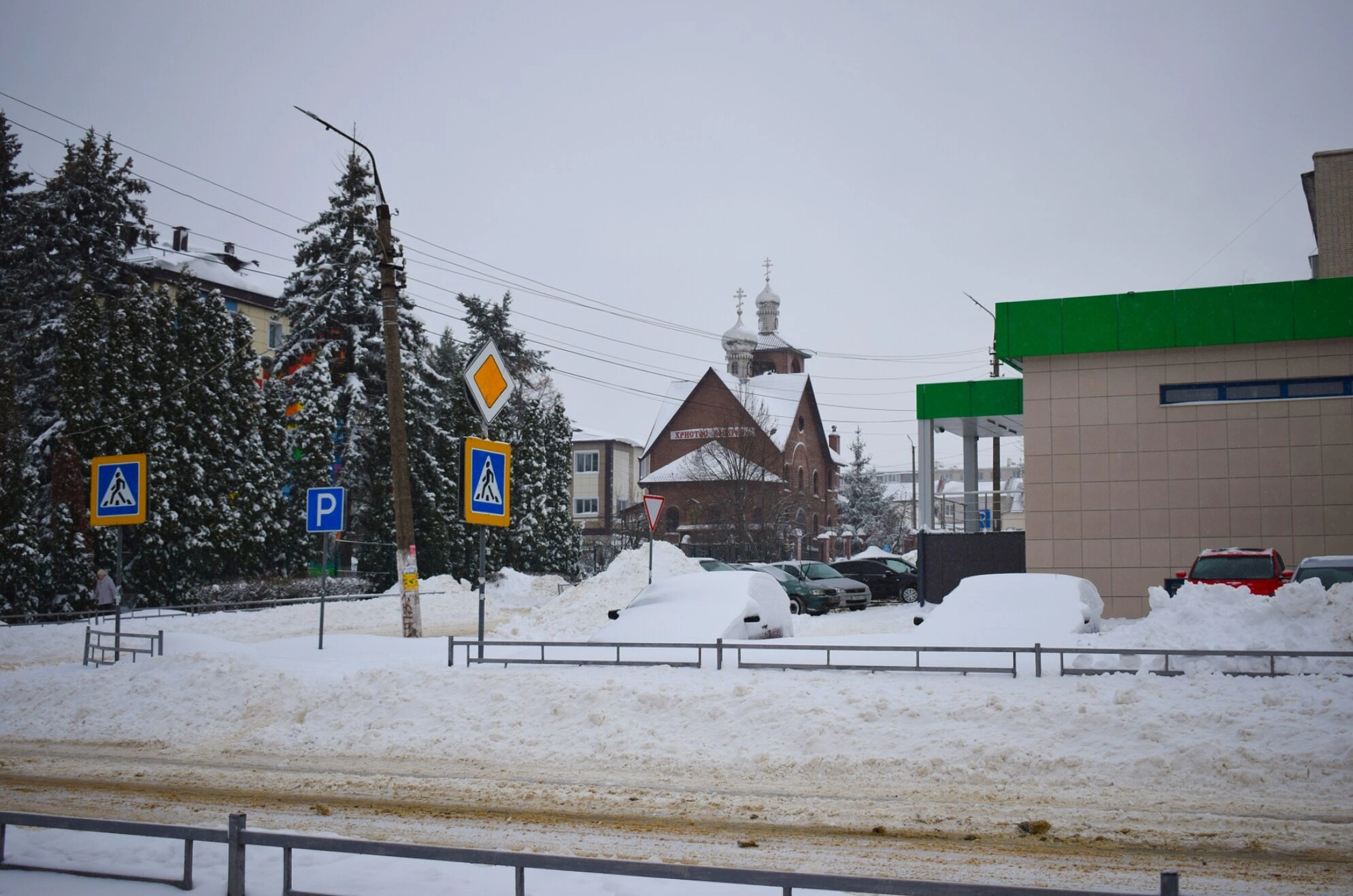 На представленной фотографии запечатлён величественный вид зимнего пейзажа с Никольской церковью в городе Ефремове Тульской области. Снимок сделан в пасмурный день, когда обильный снегопад укрыл белоснежным покровом городские улицы, деревья и кровли зданий, создавая атмосферу тихой и умиротворённой благодати.