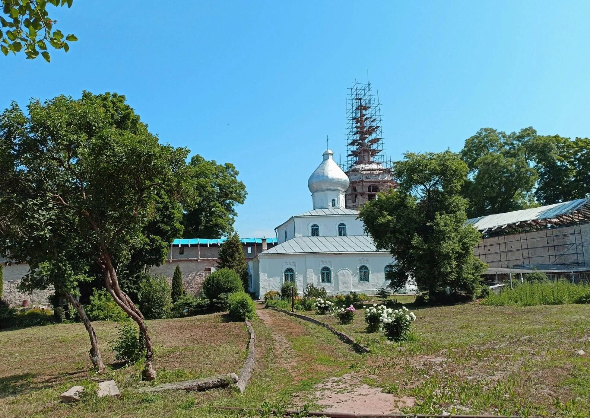 На фотографии запечатлён Никольский храм, расположенный на территории древней Порховской крепости в Псковской области. Этот православный собор, освящённый во имя святителя Николая Чудотворца, является одной из ключевых духовных и архитектурных доминант исторического центра города Порхова.