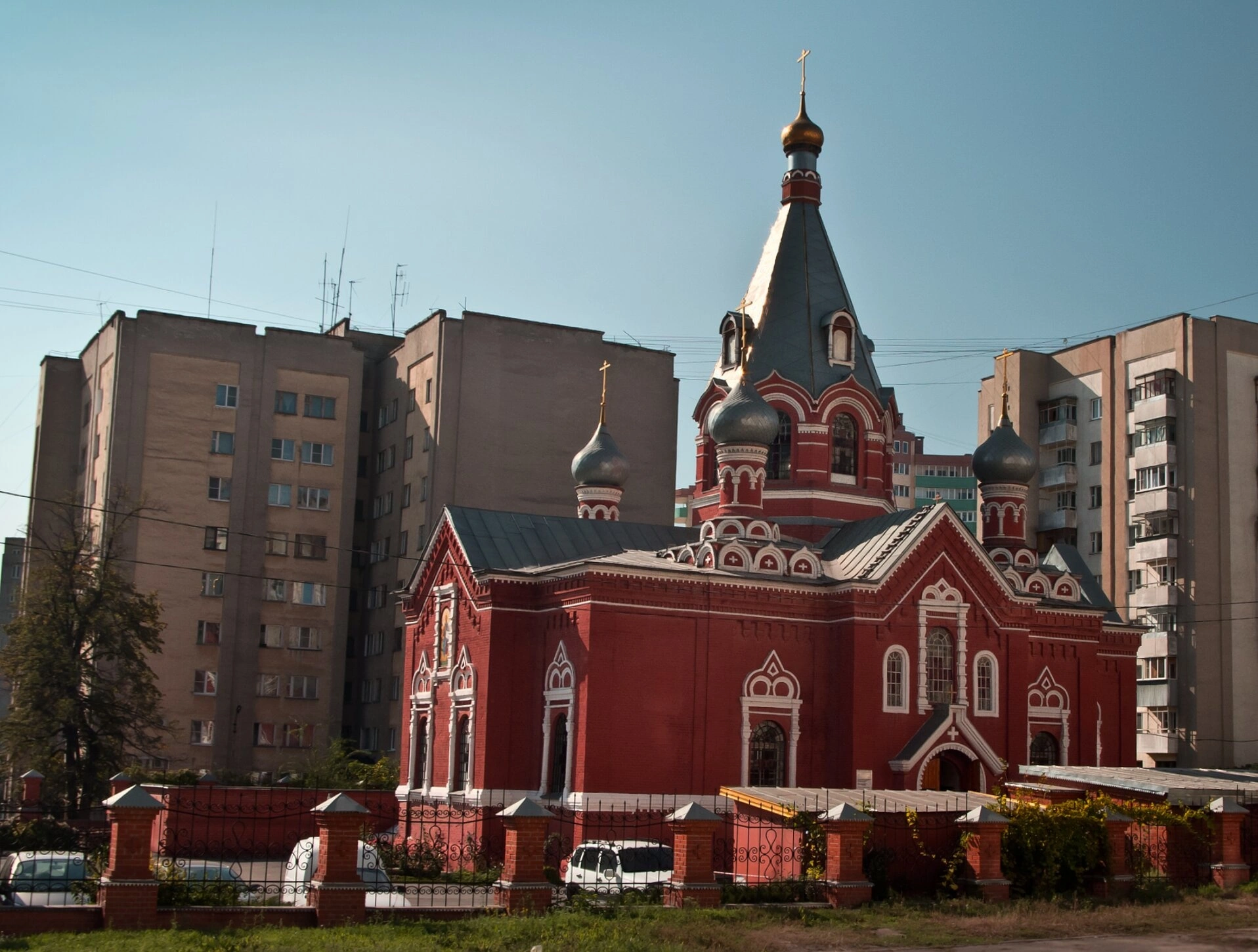 На представленной фотографии запечатлен величественный Никольский храм, расположенный в историческом центре Липецка по адресу: Торговая площадь, дом 16А. Этот православный храм, освященный в честь святителя Николая Чудотворца, был возведен в 1890 году и представляет собой выдающийся образец церковной архитектуры периода эклектики.