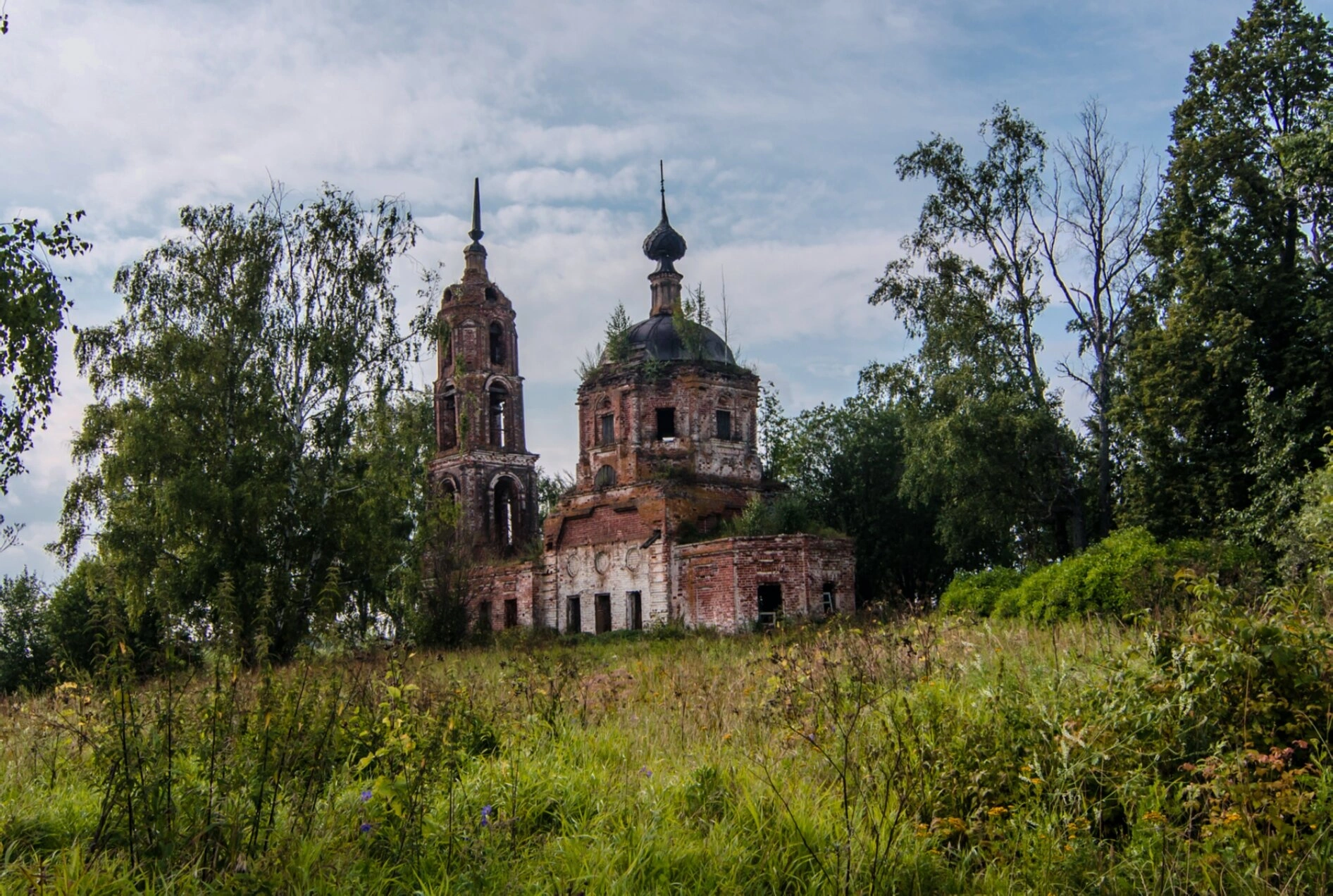 На представленной фотографии запечатлён полуразрушенный православный храм во имя святителя Николая Чудотворца, расположенный в селе Кузьмино Ивановской области. Каменная церковь, возведённая в 1831 году на средства прихожан, ныне пребывает в скорбном, запустевшем состоянии, постепенно поглощаемая природой.