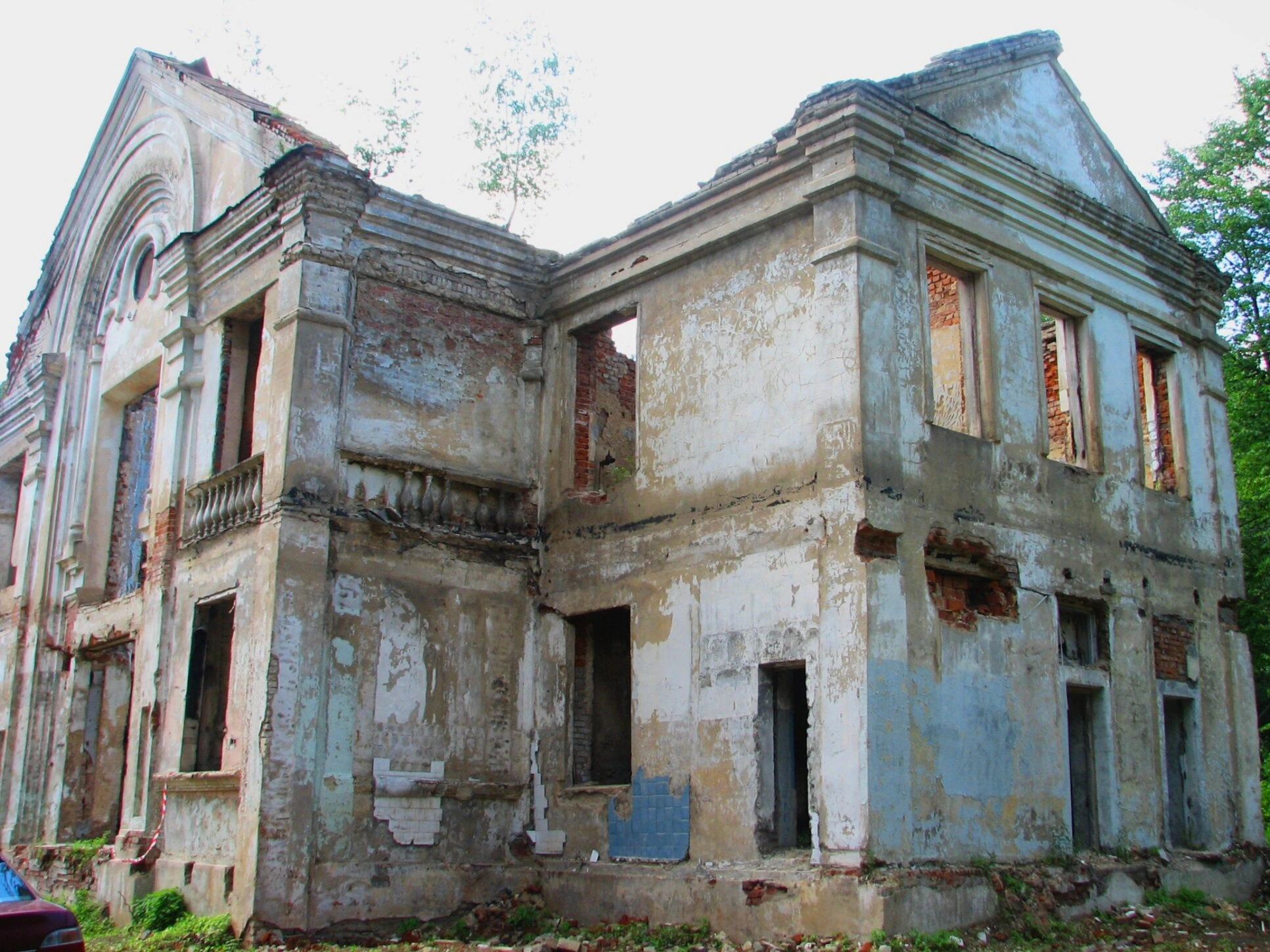 На фотографии отчётливо видны следы разрушения: обвалившаяся штукатурка, зияющие пустотой оконные проёмы, частично утраченные стены и карнизы. Буйная растительность, оплетающая стены, лишь подчёркивает долгие годы забвения. Несмотря на плачевное состояние, в облике храма ещё угадываются былые строгие и благородные архитектурные формы, напоминающие о его священном предназначении.