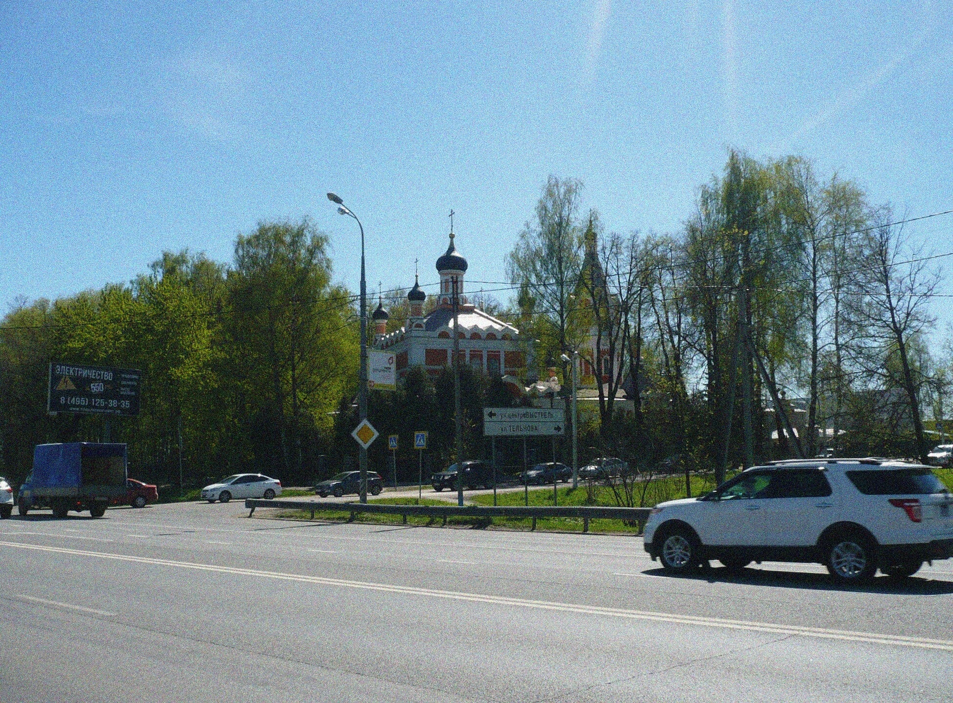 На фотографии запечатлён живописный вид на храм Святителя Николая Чудотворца в городе Солнечногорске, снятый с Ленинградского шоссе. На переднем плане изображена оживлённая автомобильная дорога, символизирующая непрерывный поток мирской жизни, а на заднем плане, на возвышенности, величественно возвышается белокаменная церковь, утопающая в зелени деревьев с молодой листвой. Чистое, ясное небо над храмом озарено солнечным светом, что создаёт ощущение божественного благословения и благодати.