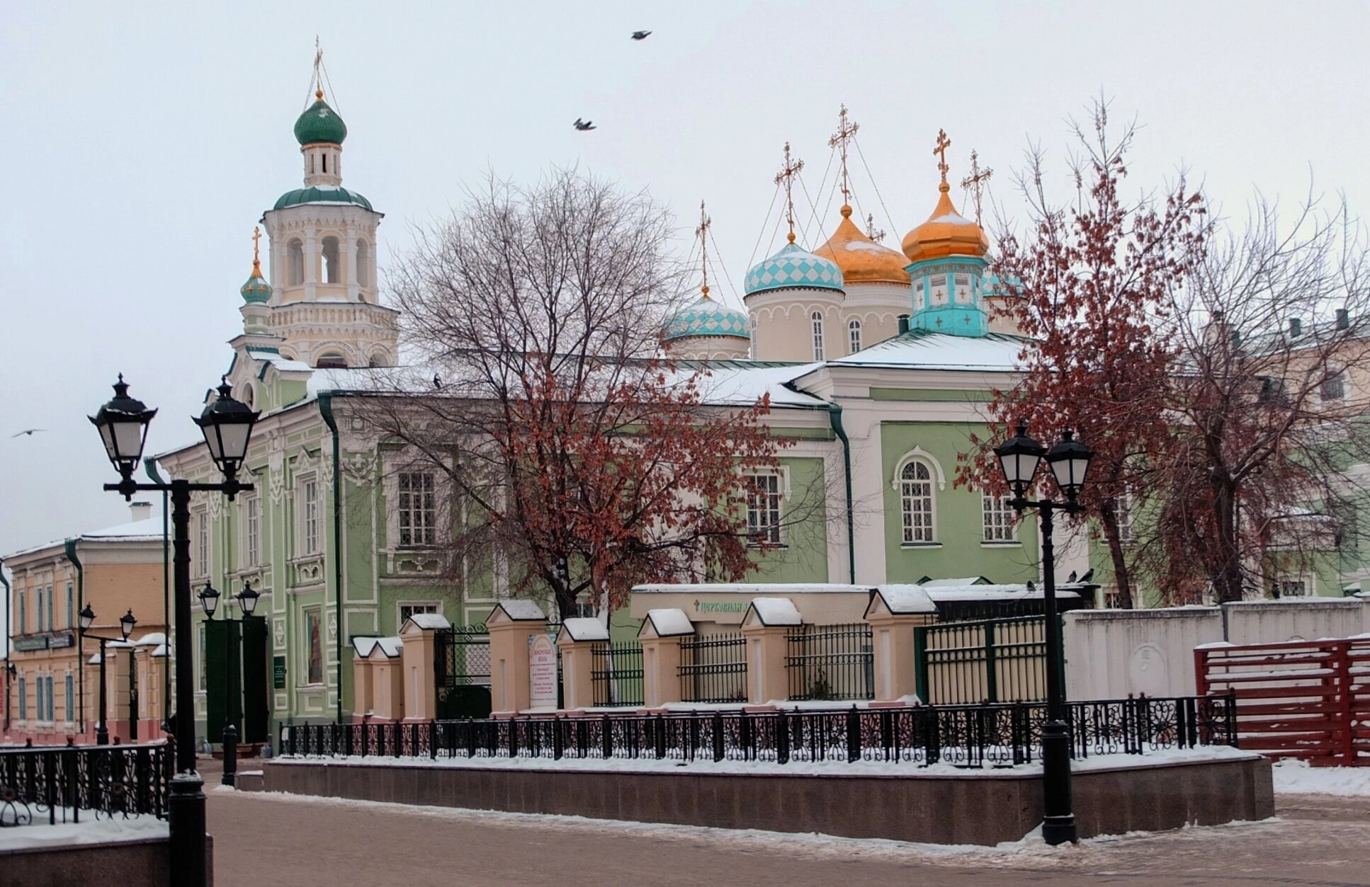 На представленной фотографии запечатлён зимний вид Никольского кафедрального собора, одного из значимых православных храмов Казани. Снимок передаёт благоговейную атмосферу святого места в холодное время года, когда снежный покров мягко укутывает церковные дворы и подчёркивает величественность архитектурного ансамбля.