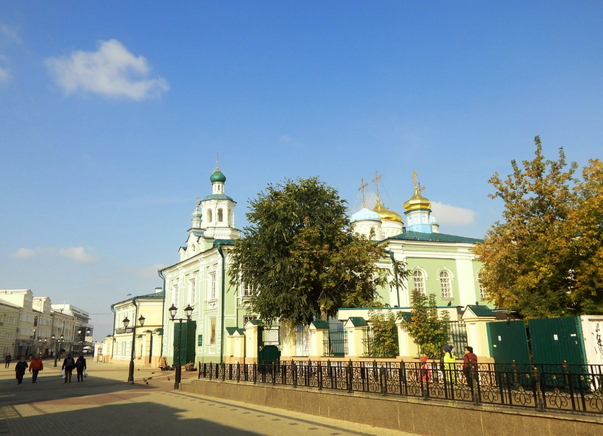 На представленной фотографии запечатлён величественный Никольский кафедральный собор, являющийся одной из главных православных святынь города Казани. Храмовой комплекс, расположенный в историческом центре города по улице Баумана, включает в себя зимнюю Покровскую церковь и летний храм во имя святителя Николая Чудотворца, что и дало собору его полное название — Николо-Нисский.