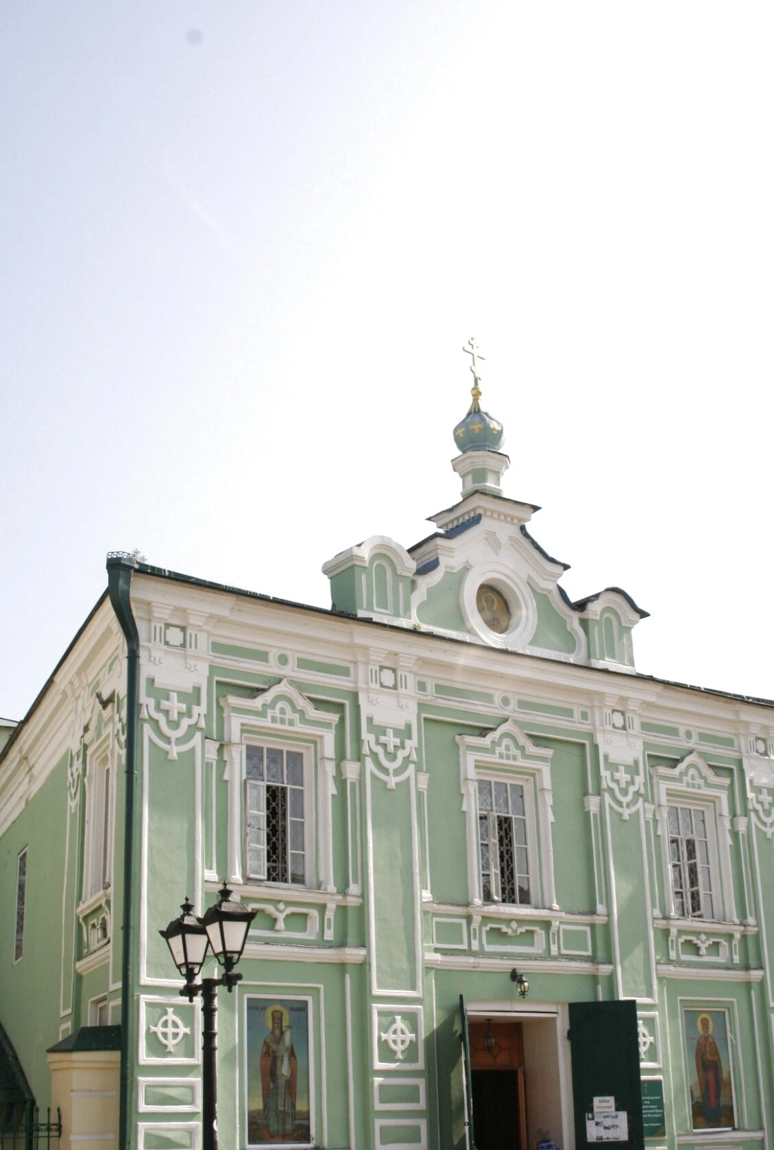 Соборный комплекс объединяет несколько храмов: Николо-Низскую церковь, Покровскую церковь и отдельно стоящую колокольню. На снимке прекрасно виден светлый фасад собора, выполненный в традициях русского церковного зодчества и окрашенный в нежные светло-зелёные тона с выразительными белыми архитектурными деталями. Венчает храм благолепный купол, устремивший в небо золочёный крест — символ христианской веры и надежды.