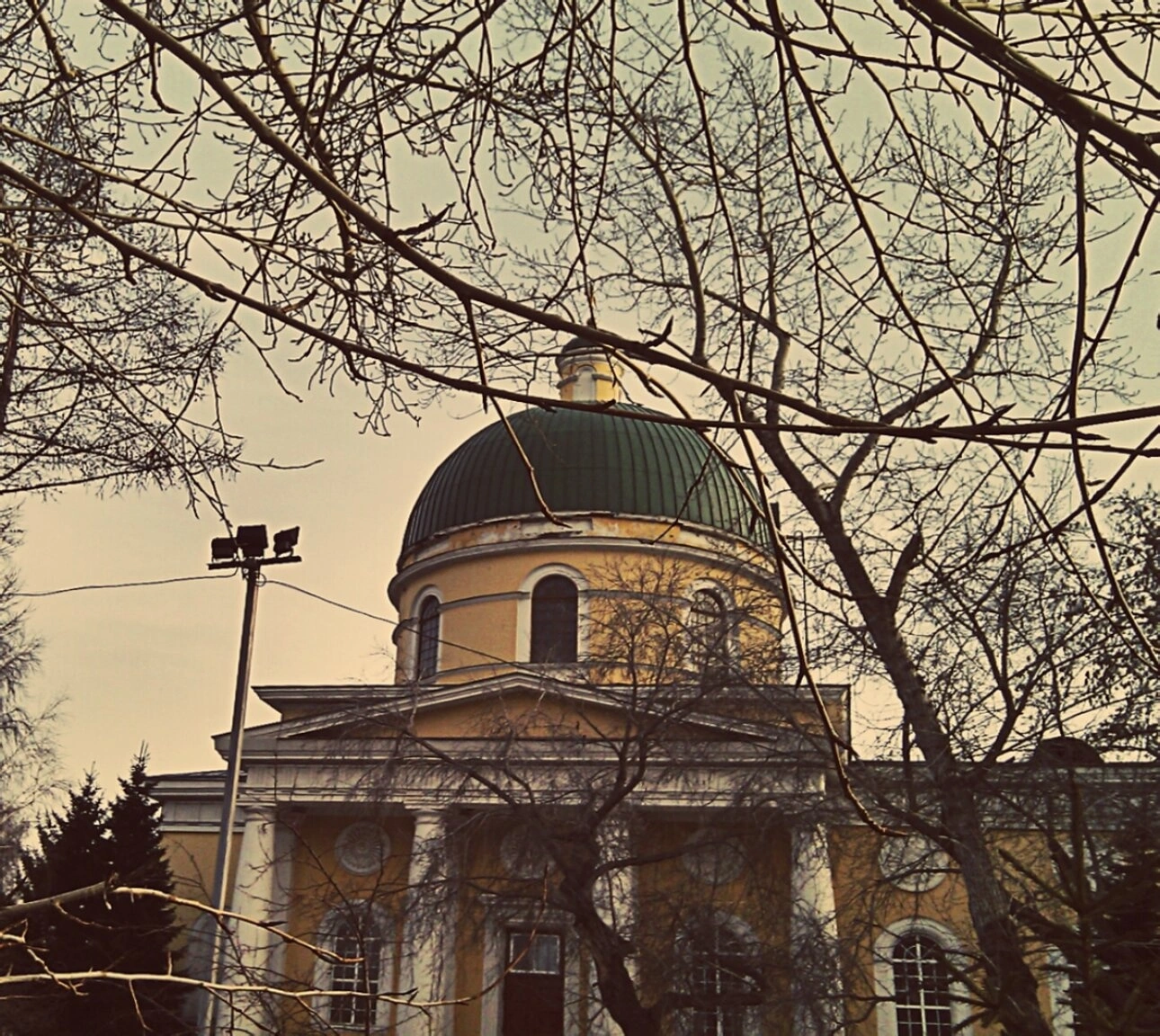 На фотографии запечатлён величественный Никольский Казачий собор, расположенный в городе Омске. Храм, освящённый во имя святителя Николая Чудотворца, является одним из духовных символов города и выдающимся памятником церковной архитектуры. Снимок передаёт торжественный вид собора в зимний период: его жёлтые стены эффектно контрастируют с голым ветвистым деревом на переднем плане и увенчаны стройным барабаном с зелёным куполом, над которым возносится золочёный крест.