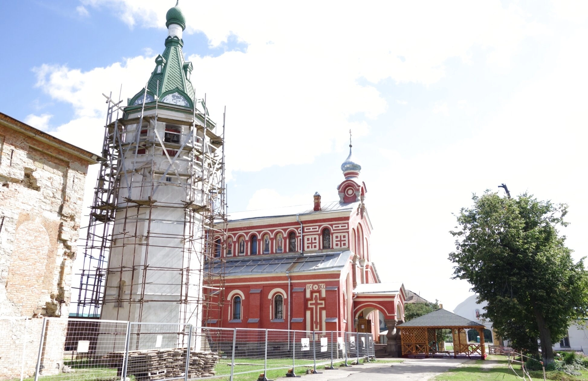 Монастырский комплекс, переживший годы запустения в советский период, ныне активно возрождается. Ведущиеся реставрационные работы на колокольне являются частью масштабной программы по восстановлению былого величия этой древней обители. Фотография передаёт атмосферу непрекращающейся жизни монастыря, где многовековая история и современные труды по сохранению наследия неразрывно связаны.