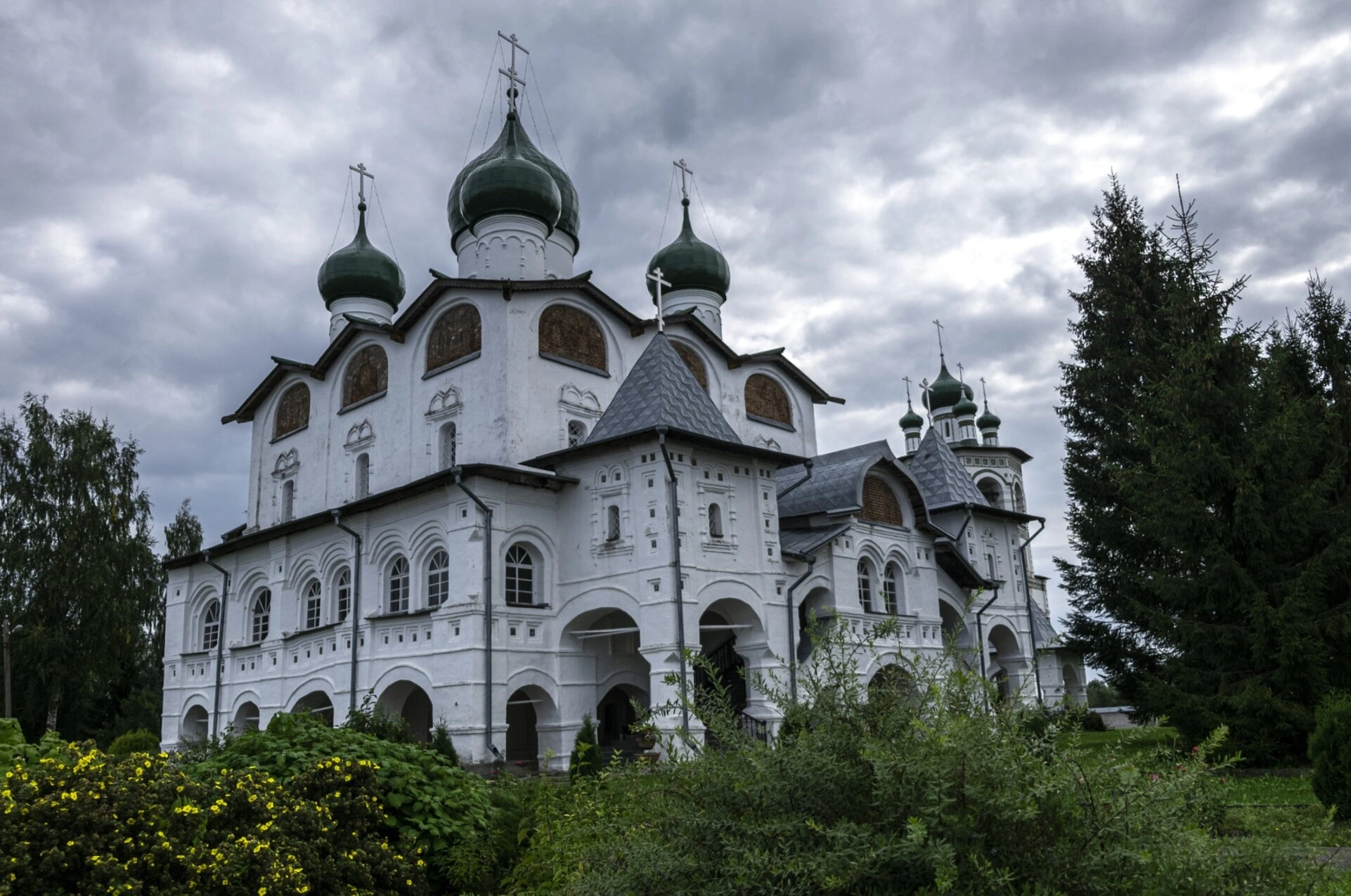 Обитель окружена живописным природным ландшафтом: вековые деревья и ухоженная зелень подчёркивают уединённый и молитвенный характер этого святого места. Пасмурное небо на фотографии добавляет изображению величия и спокойной, сосредоточенной атмосферы, напоминая о древности обители и её многовековой истории, начавшейся в конце XIV века с основания пустыни иеромонахом Пименом.