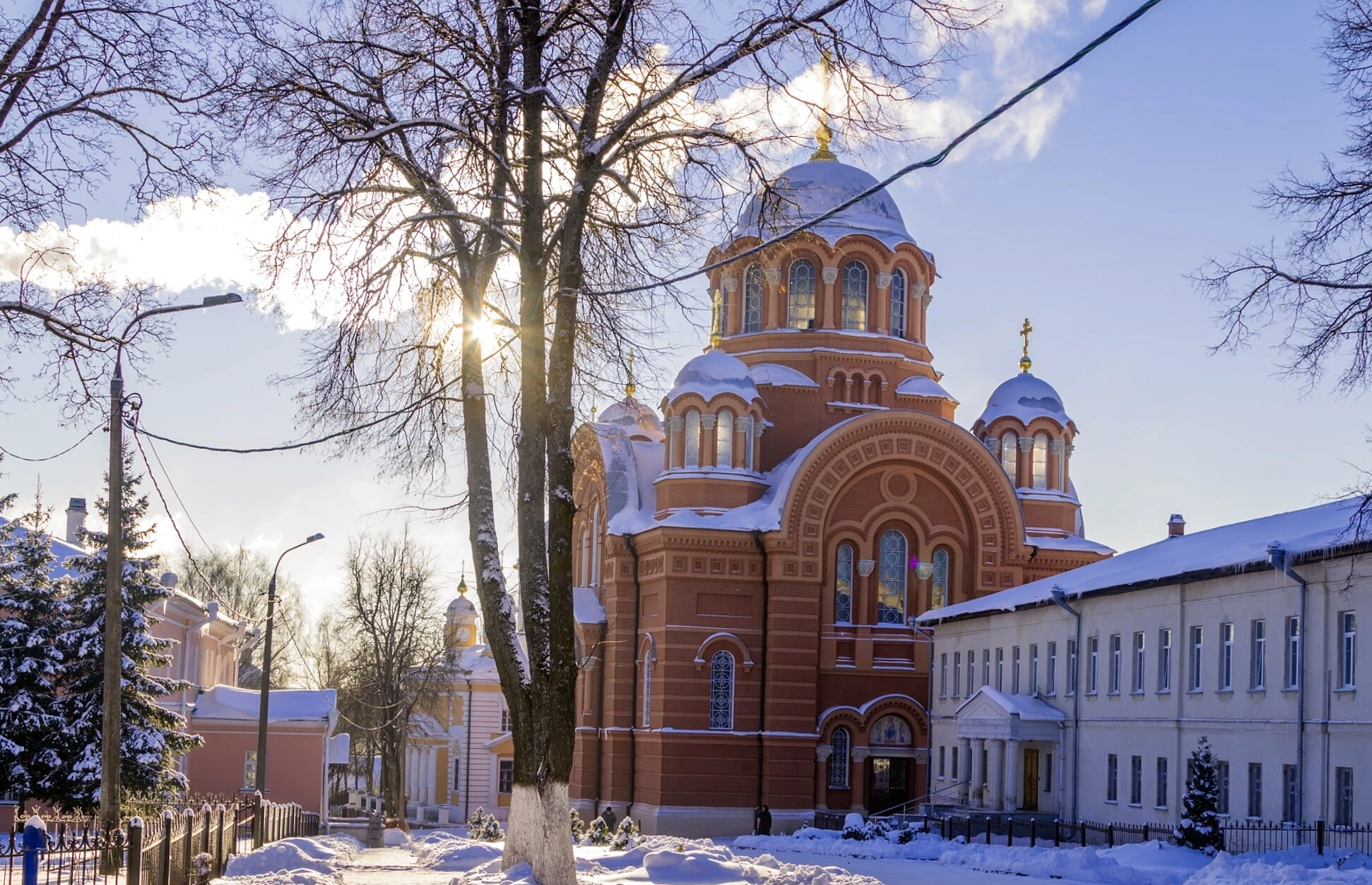 Центральным объектом на изображении выступает сам собор, освящённый во имя святителя Николая Чудотворца. Храм, возведённый в начале XX века (1900-1904 гг.), представляет собой прекрасный образец церковной архитектуры своего времени. Его нарядные золотые купола, сияющие под холодным зимним солнцем, символизируют нетварный свет православной веры и устремление горé. Кирпичные стены, контрастирующие с белизной снега, подчёркивают монументальность и величие строения.