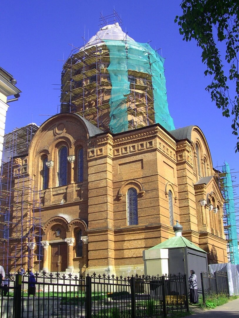 Собор, возведённый из красного кирпича, представляет собой величественный образец русского церковного зодчества. Несмотря на временные конструкции, скрывающие его полный облик, чётко читаются строгие и монументальные формы храма. На переднем плане фотографии видна ажурная металлическая ограда, подчёркивающая благоговейное отношение к священному месту.