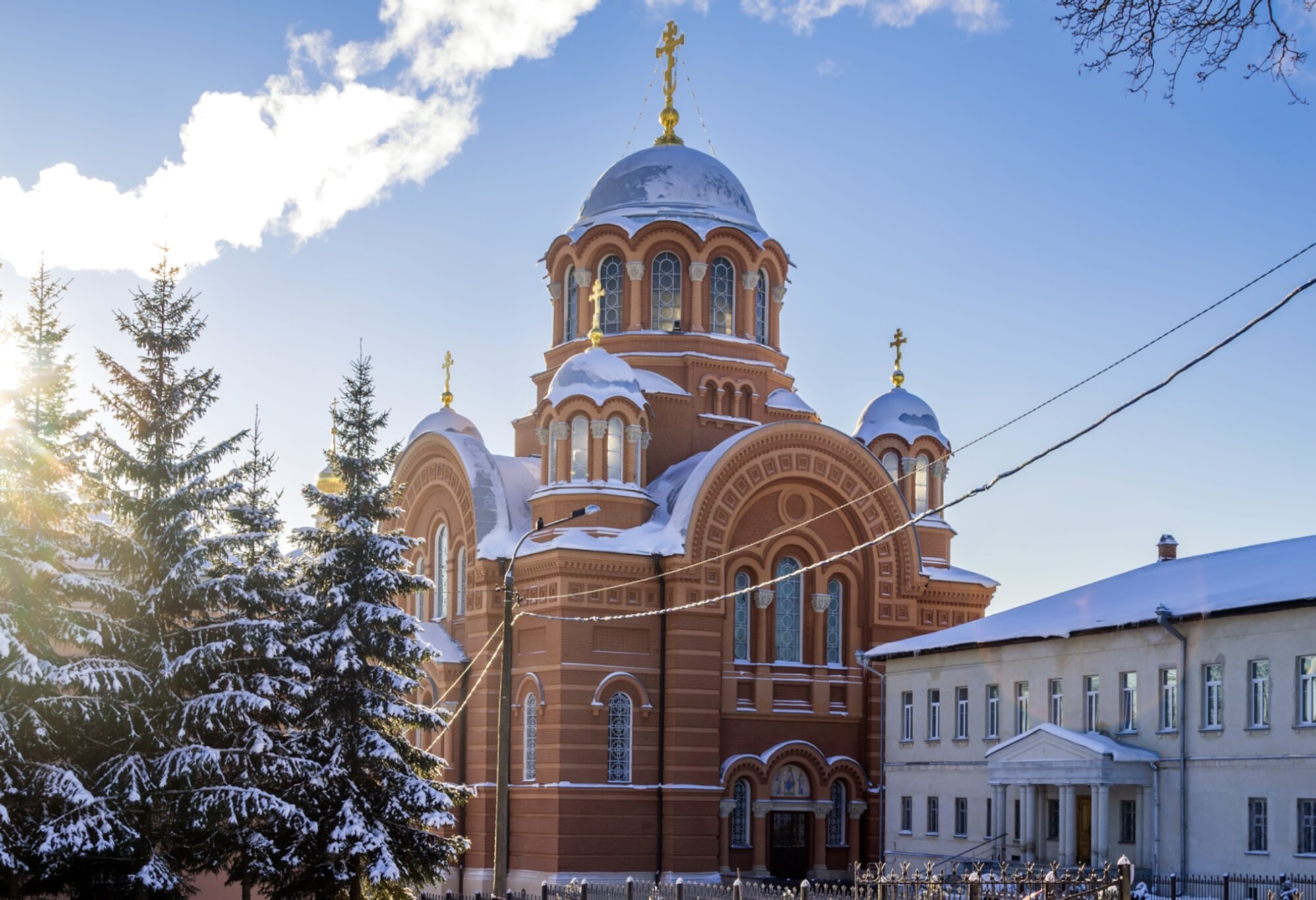 Зимний пейзаж придаёт собору и всей обители особую, благоговейную торжественность. Кирпичные стены храма, увенчанные золотыми куполами с крестами, ярко выделяются на фоне заснеженного неба. Снег покрывает кровлю, главы и землю вокруг, символизируя чистоту и духовное обновление. Заснеженные ели и ветви деревьев, лишённые листвы, обрамляют собор, подчёркивая его монументальность и строгую красоту православной архитектуры.