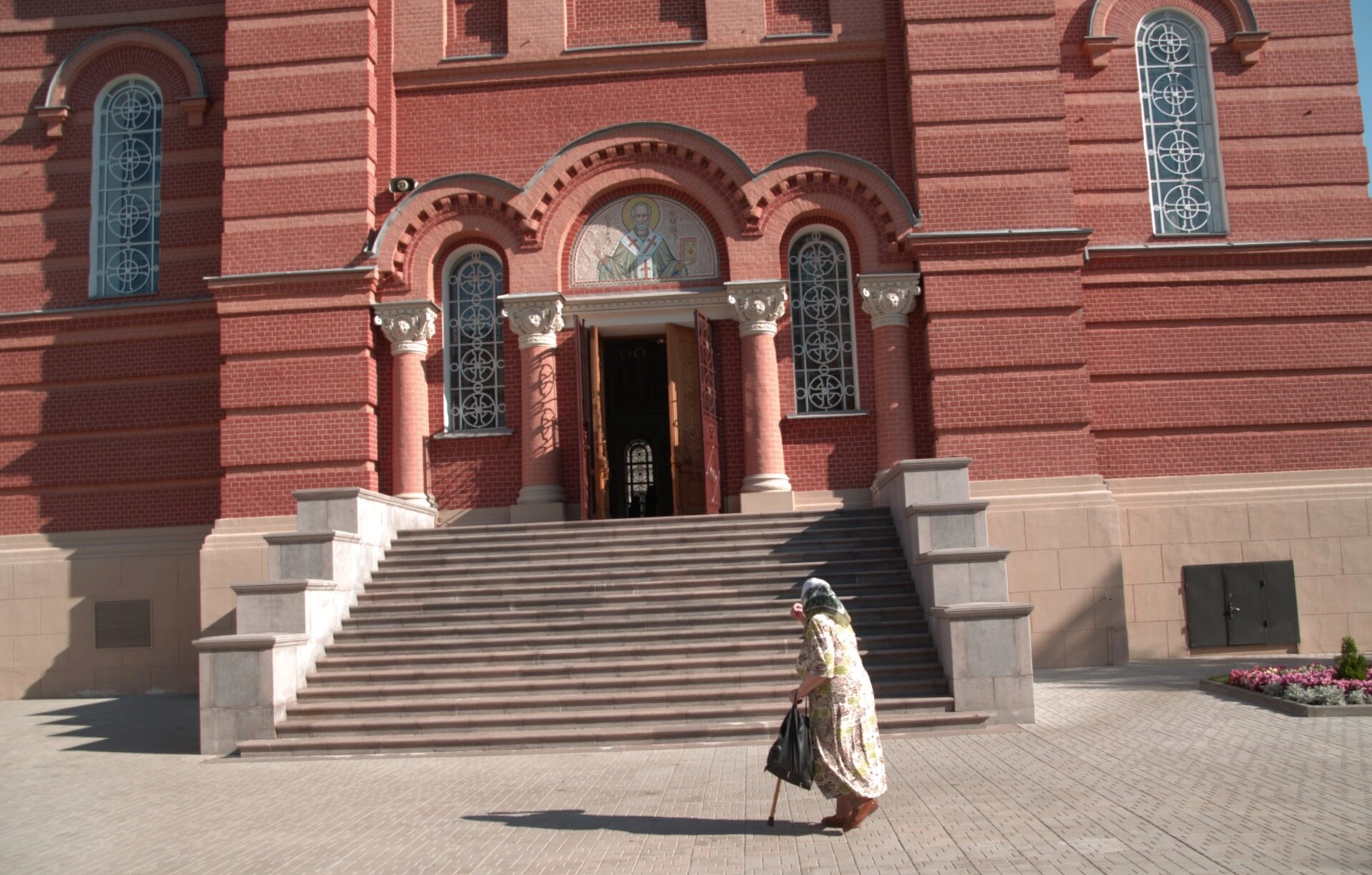Фасад собора богато украшен кирпичным узорочьем, аркатурными поясами и кокошниками, что создаёт ощущение праздничности и торжественности. На фотографии хорошо просматривается центральный золотой купол, символизирующий Христа, и четыре синих купола со звёздами, посвящённые евангелистам. Главный престол храма освящён в честь святителя Николая Чудотворца, особо почитаемого на Руси угодника Божия.