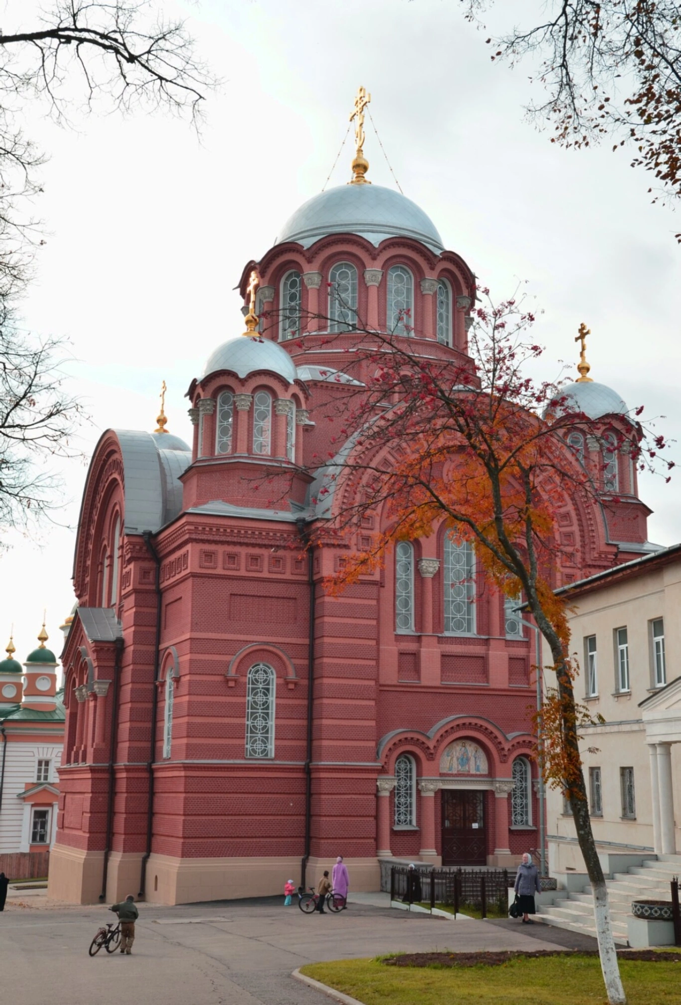 Собор Николая Чудотворца был построен в начале XX века по проекту архитектора Александра Латкова в неорусском стиле. Он является одним из самых значительных сооружений монастырского ансамбля. На переднем плане фотографии видно дерево с огненно-оранжевой осенней листвой, подчёркивающее духовную красоту и вечность святого места. На территории обители видны люди, что свидетельствует о том, что это не просто архитектурный памятник, а действующий духовный центр, привлекающий множество паломников и туристов.