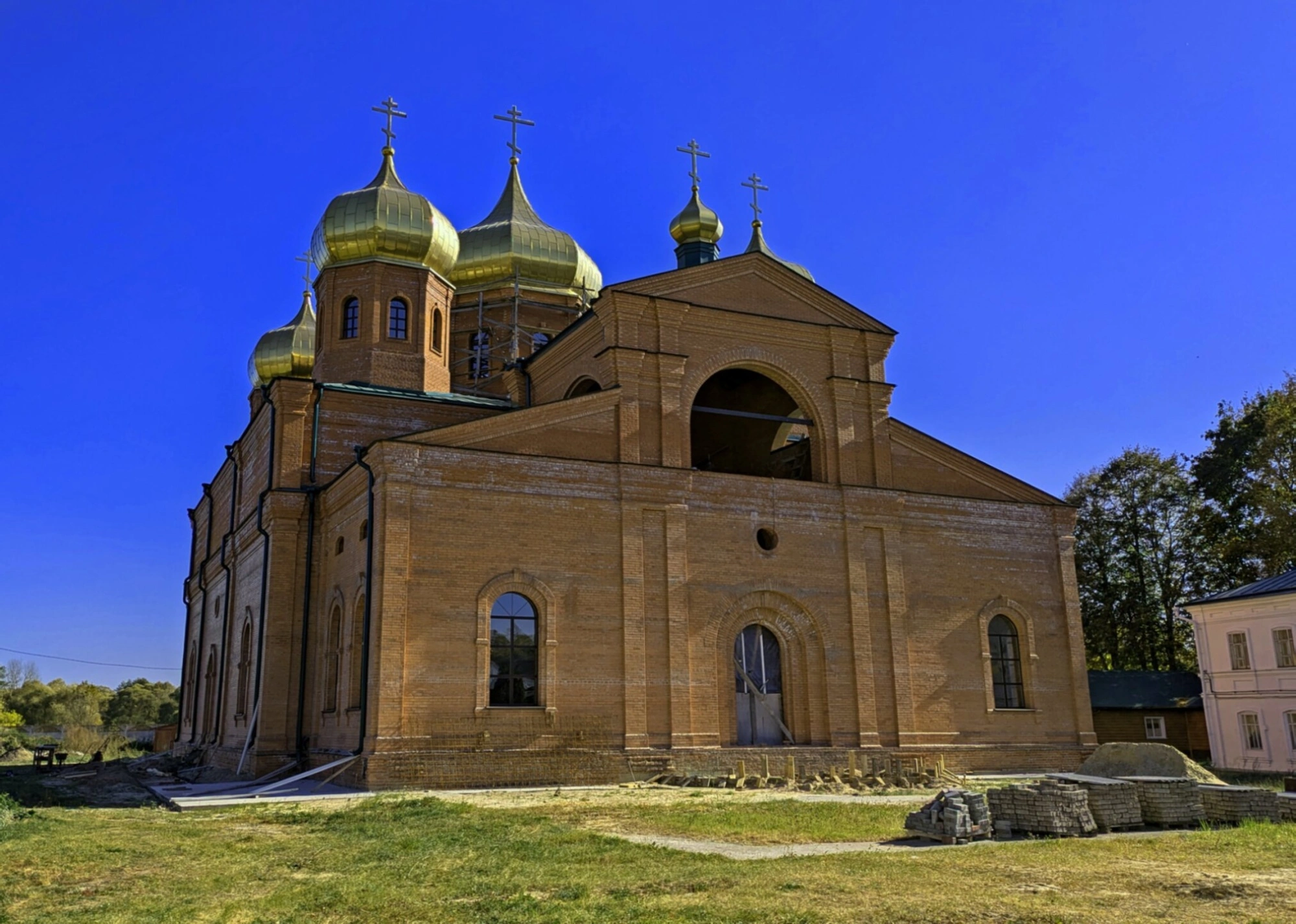 На момент совершения фотосъёмки территория вокруг собора ещё благоустраивалась, что видно по наличию строительных материалов, что свидетельствует о непрестанных трудах по восстановлению древней обители. Чистое голубое небо, простирающееся над святыней, символически подчёркивает духовную чистоту и высоту предназначения этого места. Собор является не только архитектурной доминантой, но и средоточием молитвенной жизни монастыря, привлекая паломников и верующих из разных уголков России.