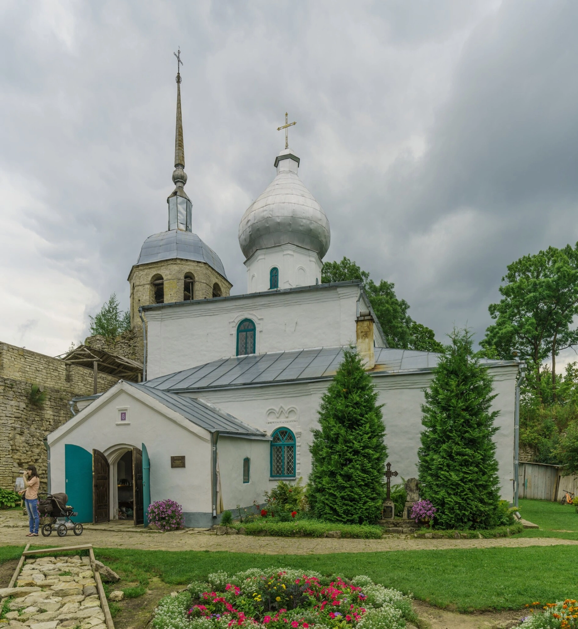 На представленной фотографии запечатлён старинный Никольский собор, расположенный в пределах древней Порховской крепости в Псковской области. Этот православный храм, освящённый во имя святителя Николая Чудотворца, является одной из главных духовных и архитектурных доминант каменной крепости, основанной святым благоверным князем Александром Невским в XIII столетии.