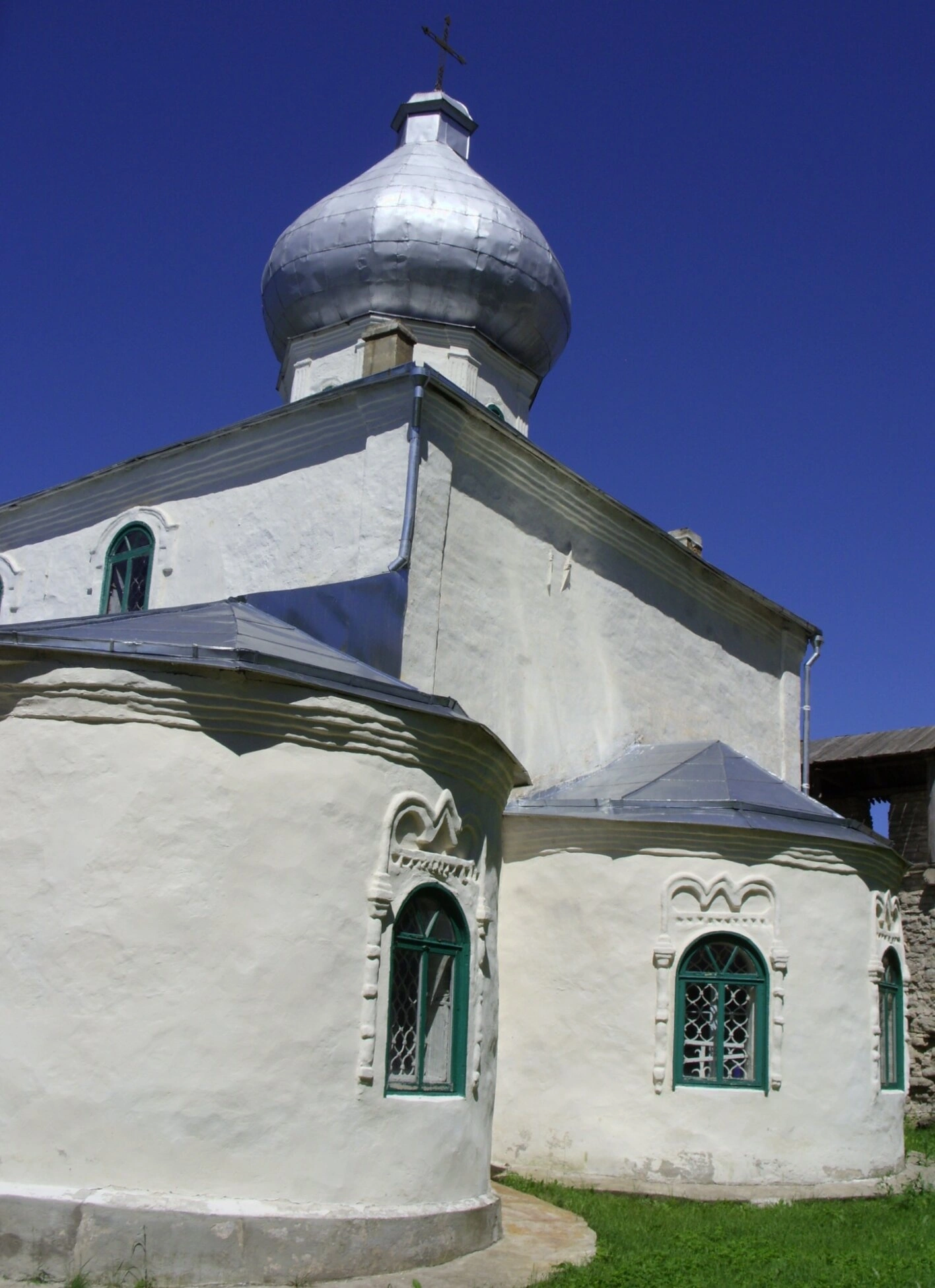 Собор был возведён из местной известняковой плиты в XIV столетии и представляет собой величественный образец псковской архитектурной школы. Белоснежные стены храма, увенчанные мощным серебристым куполом, на котором гордо восседает православный крест, символизируют чистоту веры и устремлённость к горнему миру. Купол, имеющий шлемовидную форму, традиционную для древнерусского зодчества, покрыт металлом, что придаёт ему благородный вид и устойчивость к суровому северному климату.