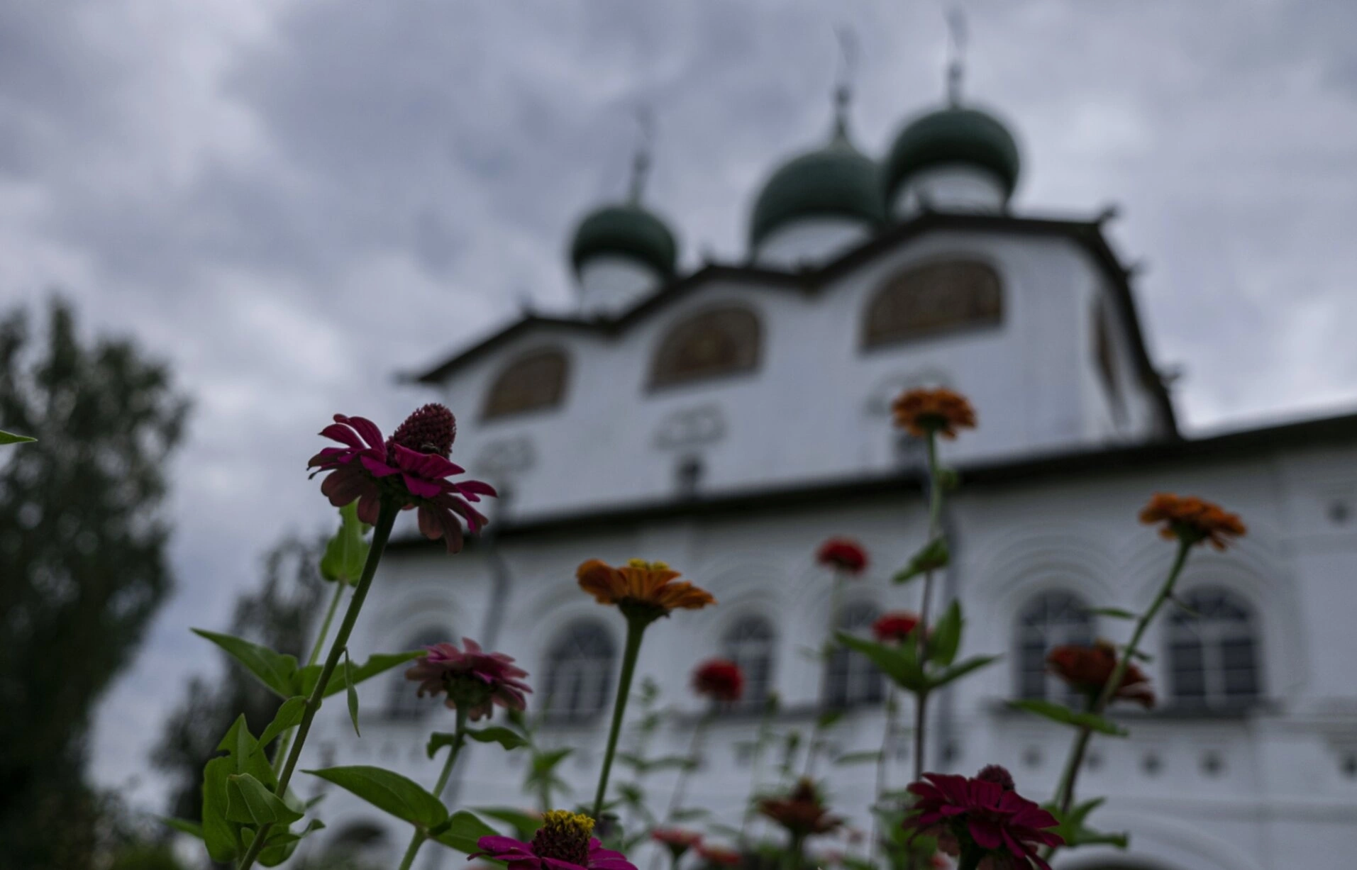 На представленной фотографии запечатлён величественный Никольский собор, являющийся архитектурным центром ставропигиального Вяжищского монастыря Новгородской епархии. Снимок выполнен с художественным мастерством - обильно цветущие циннии создают живописный размытый передний план, через который открывается вид на святыню.