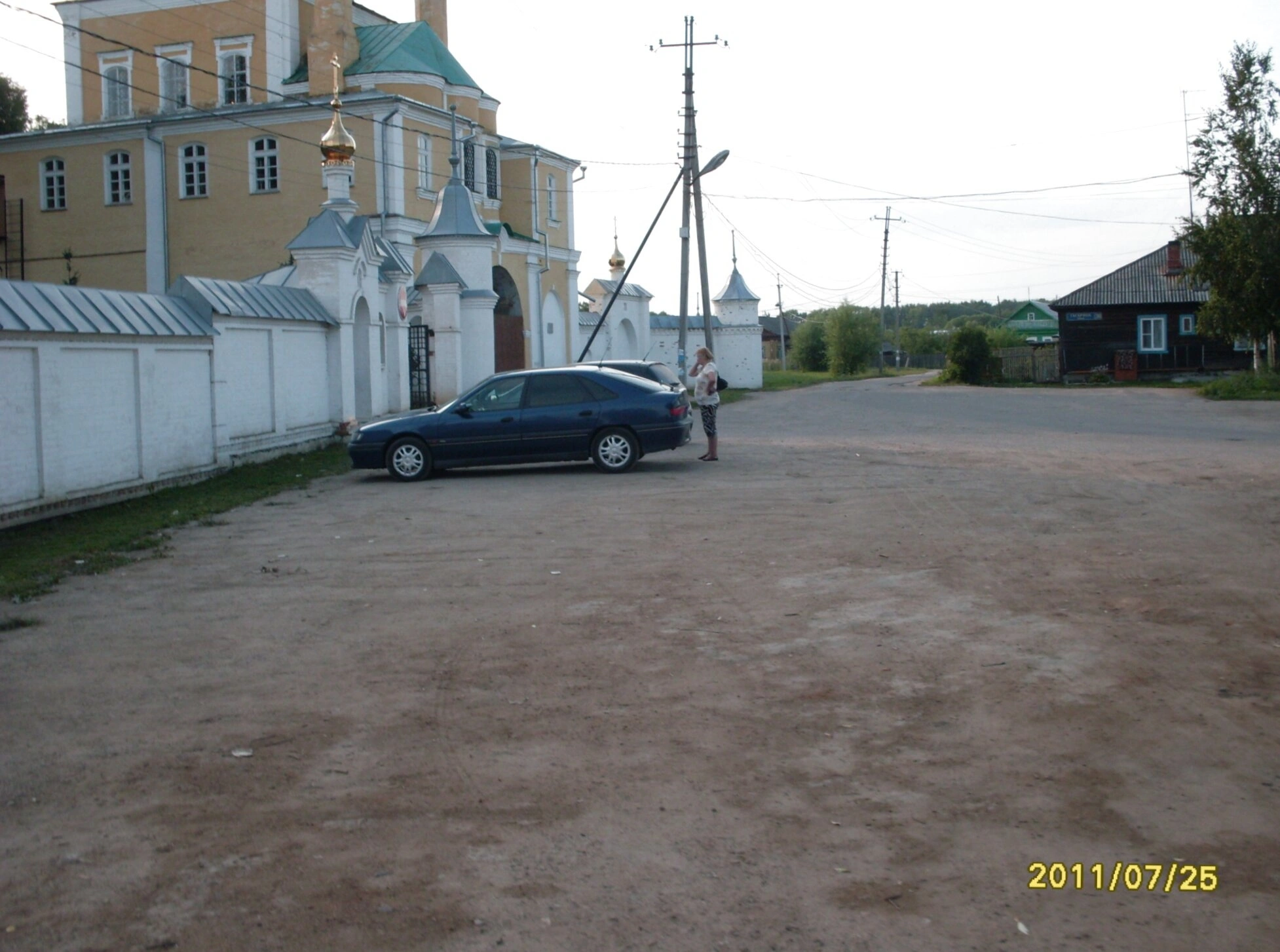 Монастырский комплекс гармонично вписан в окружающий ландшафт. На переднем плане видна грунтовая площадка, а у монастырской ограды припаркован автомобиль, что добавляет кадру элемент повседневной жизни. За могучими стенами обители виднеются жилые дома и зелёные кроны деревьев, создающие ощущение уюта и единства духовного и мирского.