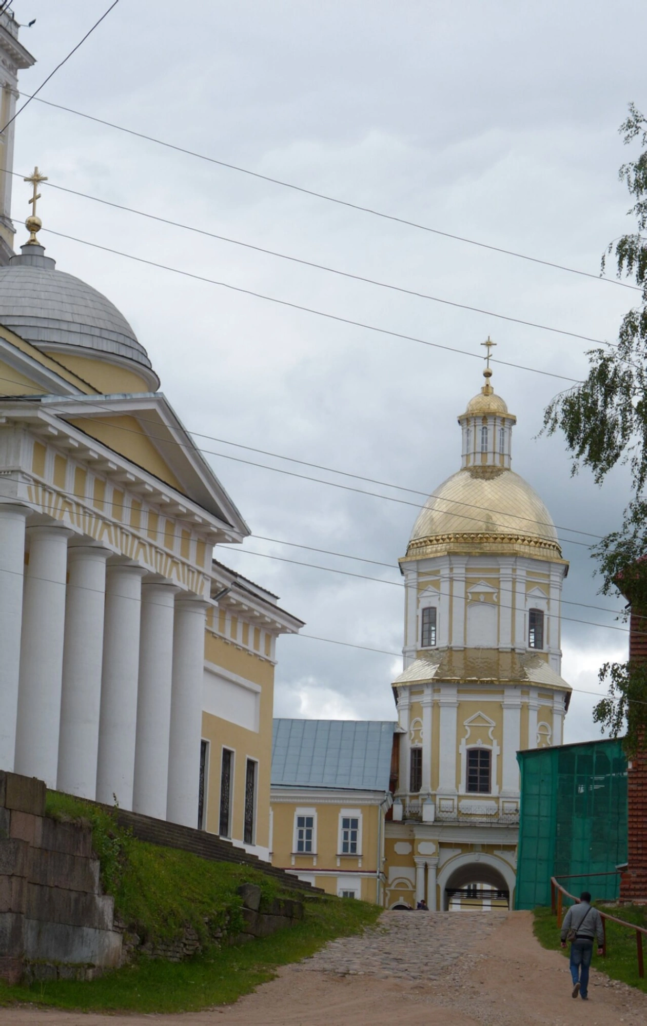 Дорога, вымощенная брусчаткой, направляет взгляд зрителя вглубь святой обители, к другим её храмам и келейным корпусам. Пасмурное небо, отражающееся в водах Селигера, наполняет изображение особой, созерцательной атмосферой, напоминая о строгом иноческом подвиге, совершаемом в этих стенах. Зелень деревьев и одинокая фигура человека, идущего по дороге, добавляют кадру живости и масштаба, подчеркивая незыблемость и величие древней монашеской цитадели.
