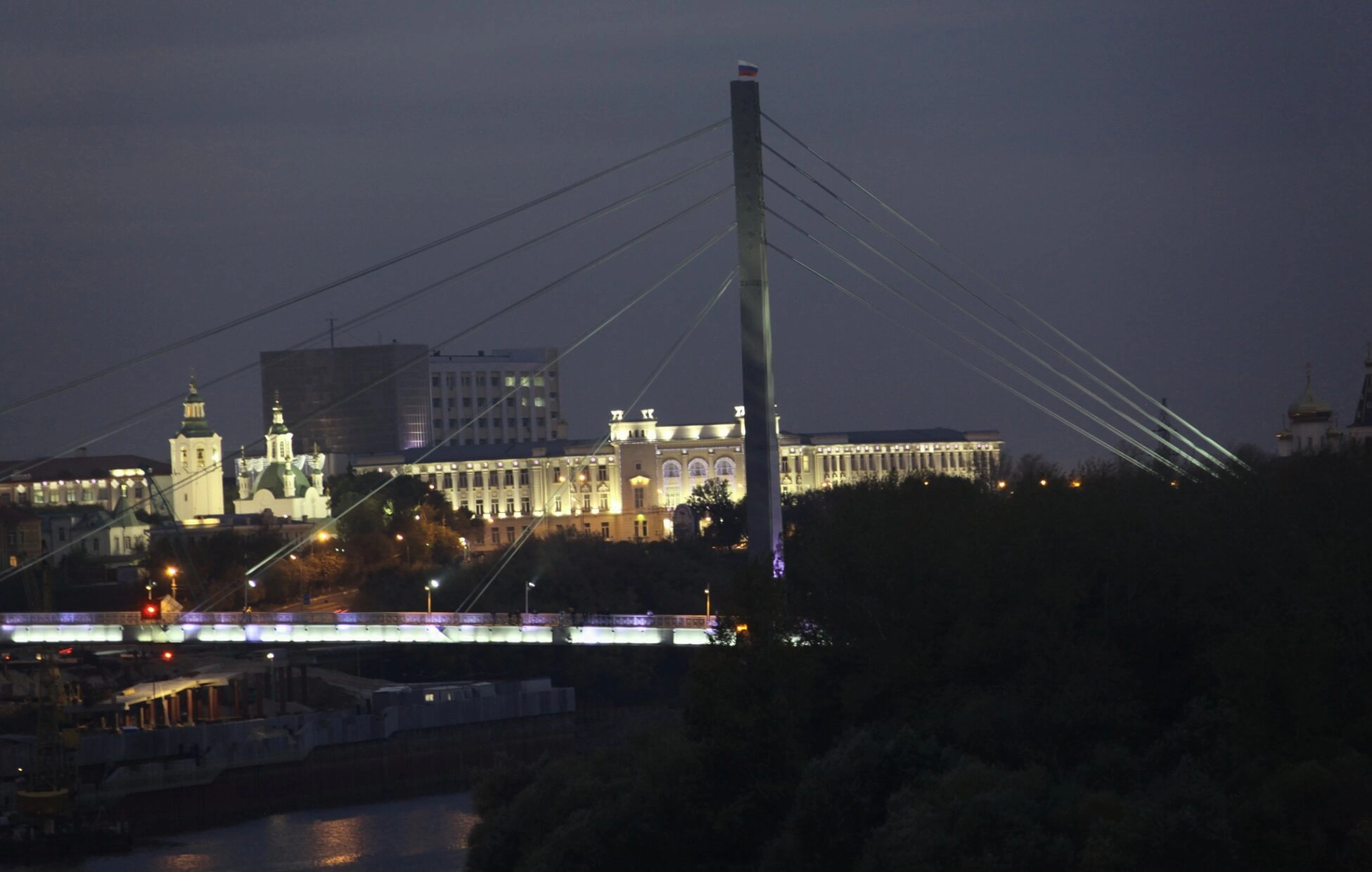 На заднем плане открывается панорама современного города с подсвеченными окнами жилых зданий, что создаёт гармоничное сочетание древней святыни и современной урбанистической среды. Тёмные силуэты деревьев на переднем плане обрамляют данный вид, добавляя ему глубины и естественности. Ночное освещение подчёркивает архитектурные детали как моста, так и храма, превращая инженерное сооружение и дом Божий в единое произведение искусства, наполненное тишиной, спокойствием и молитвенной торжественностью.