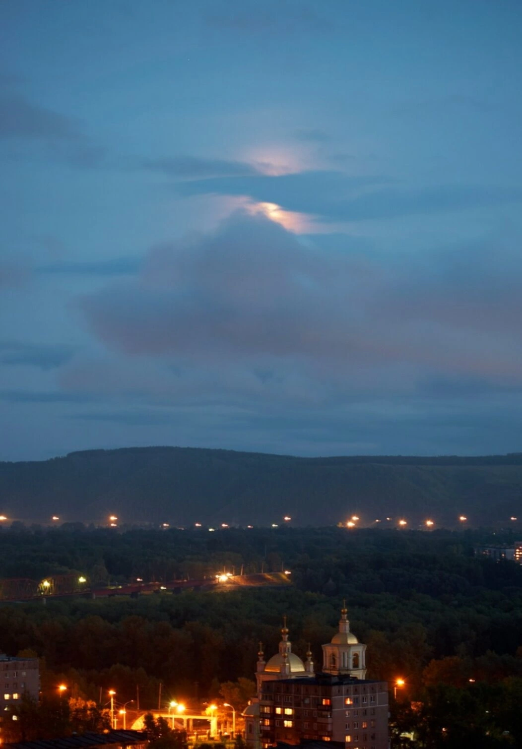 На переднем плане видны огни жилых кварталов, а вдали простирается тёмный массив тайги, подчеркивающий масштабы сибирского индустриального города. Небесный свод, покрытый облаками, озарён таинственным светом луны, что создаёт умиротворённую и благоговейную атмосферу. Преобладание глубоких синих и тёплых золотистых оттенков на снимке символично: синий цвет означает небесную чистоту и Богородицу, а золотой — Божественную славу и нетварный свет.