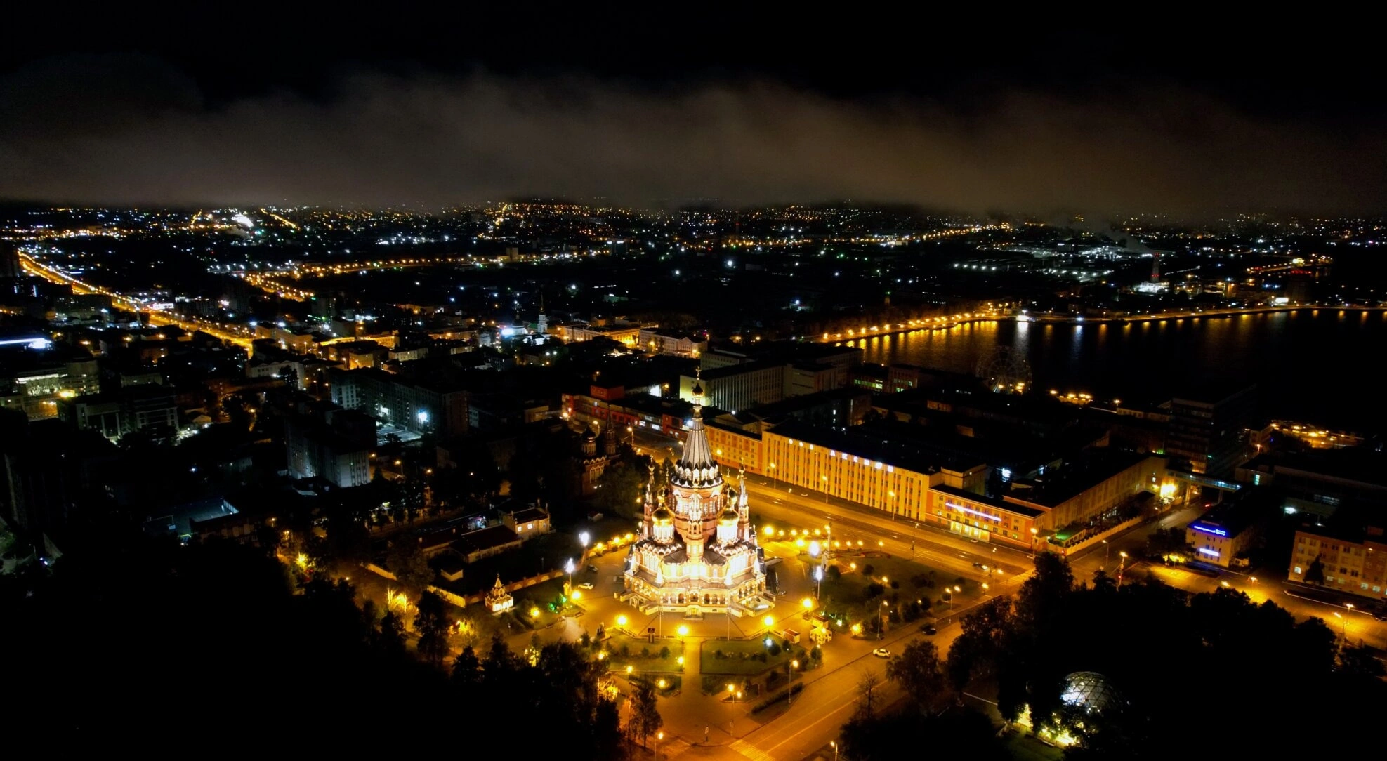 На представленной фотографии запечатлён величественный Свято-Михайловский собор, расположенный в столице Удмуртской Республики — городе Ижевске. Ночной ракурс раскрывает всю красоту и духовное величие этого православного храма, который является одним из символов города и важнейшим центром духовной жизни всего региона.