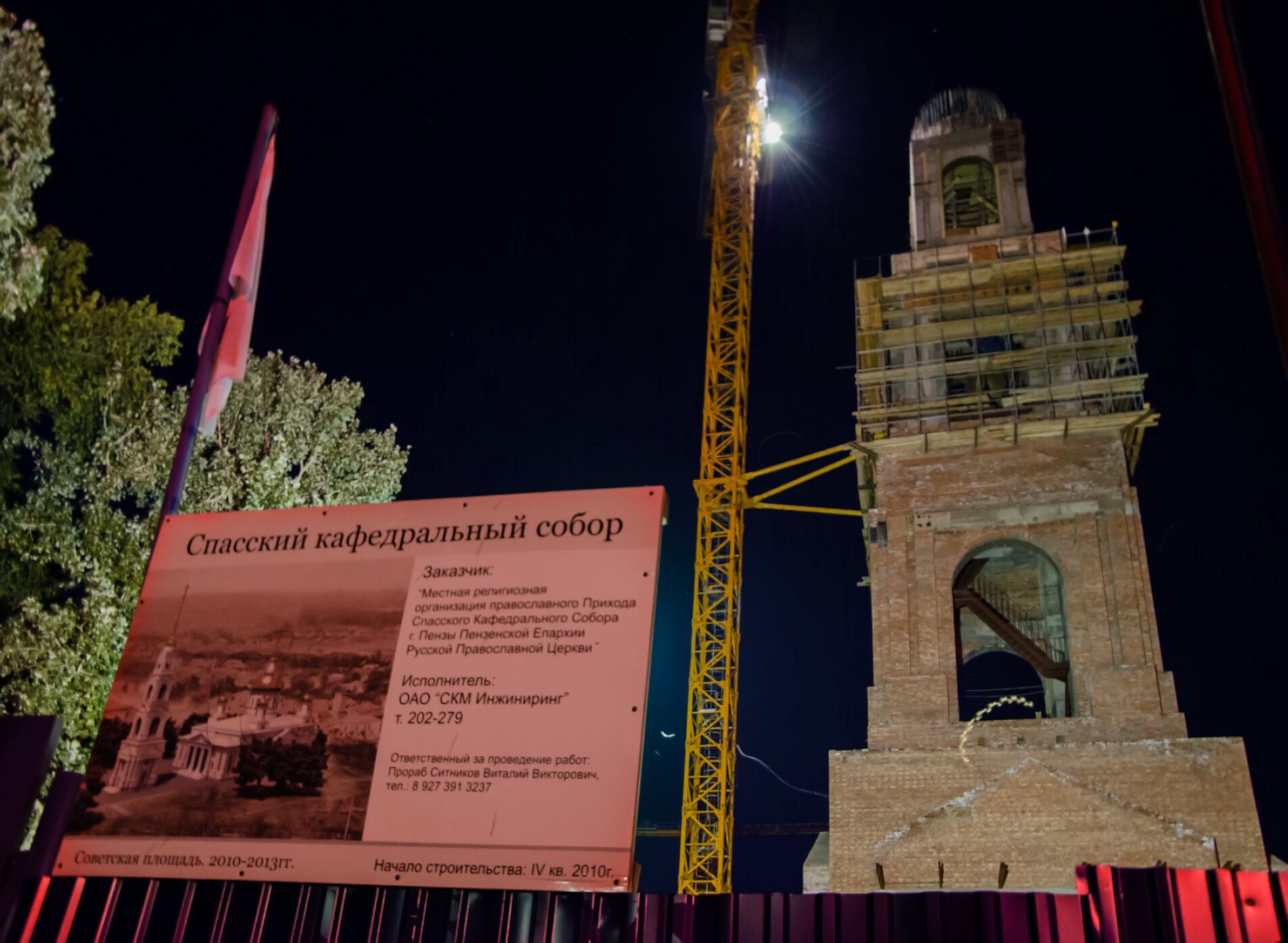 На переднем плане фотографии расположен информационный щит, сообщающий ключевые подробности о святом проекте. Из него мы узнаём, что заказчиком строительства выступила местная религиозная организация православного Прихода Спасского Кафедрального Собора, а работы вело Открытое акционерное общество «СКМ Инжиниринг». Особо отмечено, что ответственным за проведение работ был прораб Виталий Викторович Ситников.
