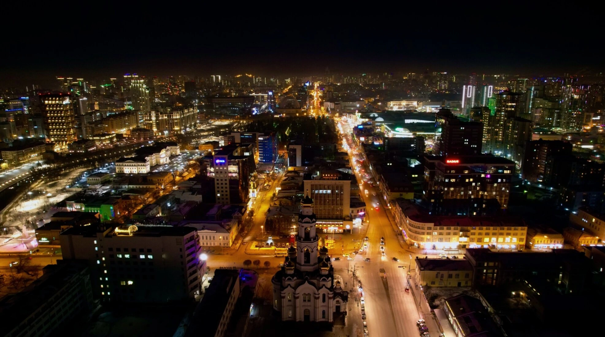 На представленной фотографии запечатлён величественный ночной вид Екатеринбурга, одного из крупнейших городов России. В нижней части снимка, занимая центральное смысловое и композиционное положение, возвышается прекрасно освещённый храм-колокольня во имя святого священномученика Иоанна Златоуста, известный в народе как Большой Златоуст. Его золотые купола и кресты, сияющие в ночи, создают мощный духовный акцент, напоминая о глубоких православных традициях Уральской земли.