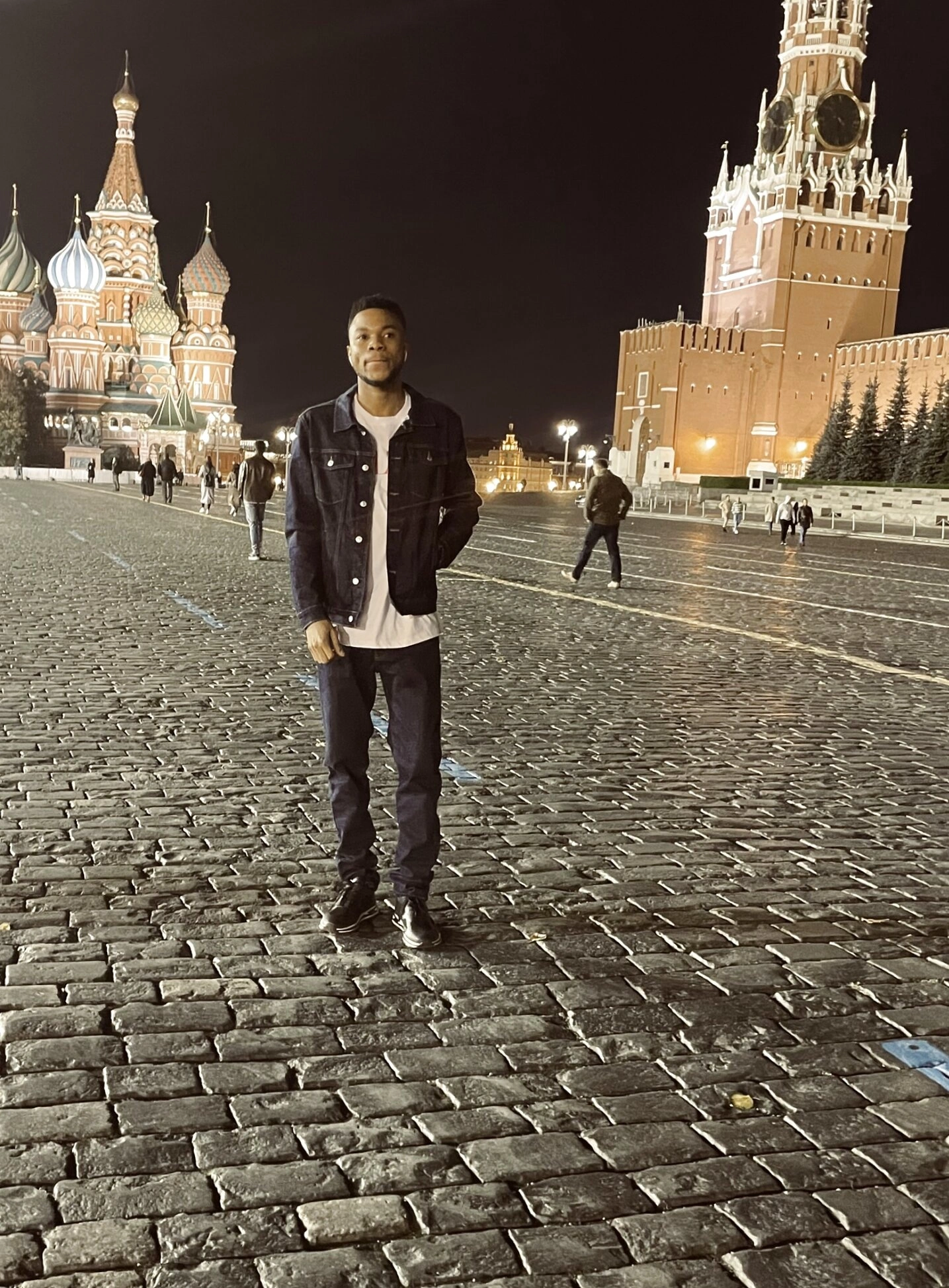 На переднем плане снимка видна историческая брусчатка Красной площади, на которой стоит мужчина, что позволяет оценить масштаб архитектурного ансамбля. В среднем плане, у подножия собора, видны другие люди, что добавляет кадру жизненную динамику. Справа возвышается Спасская башня с знаменитыми курантами — символ государственности и неотъемлемая часть священного пространства площади.