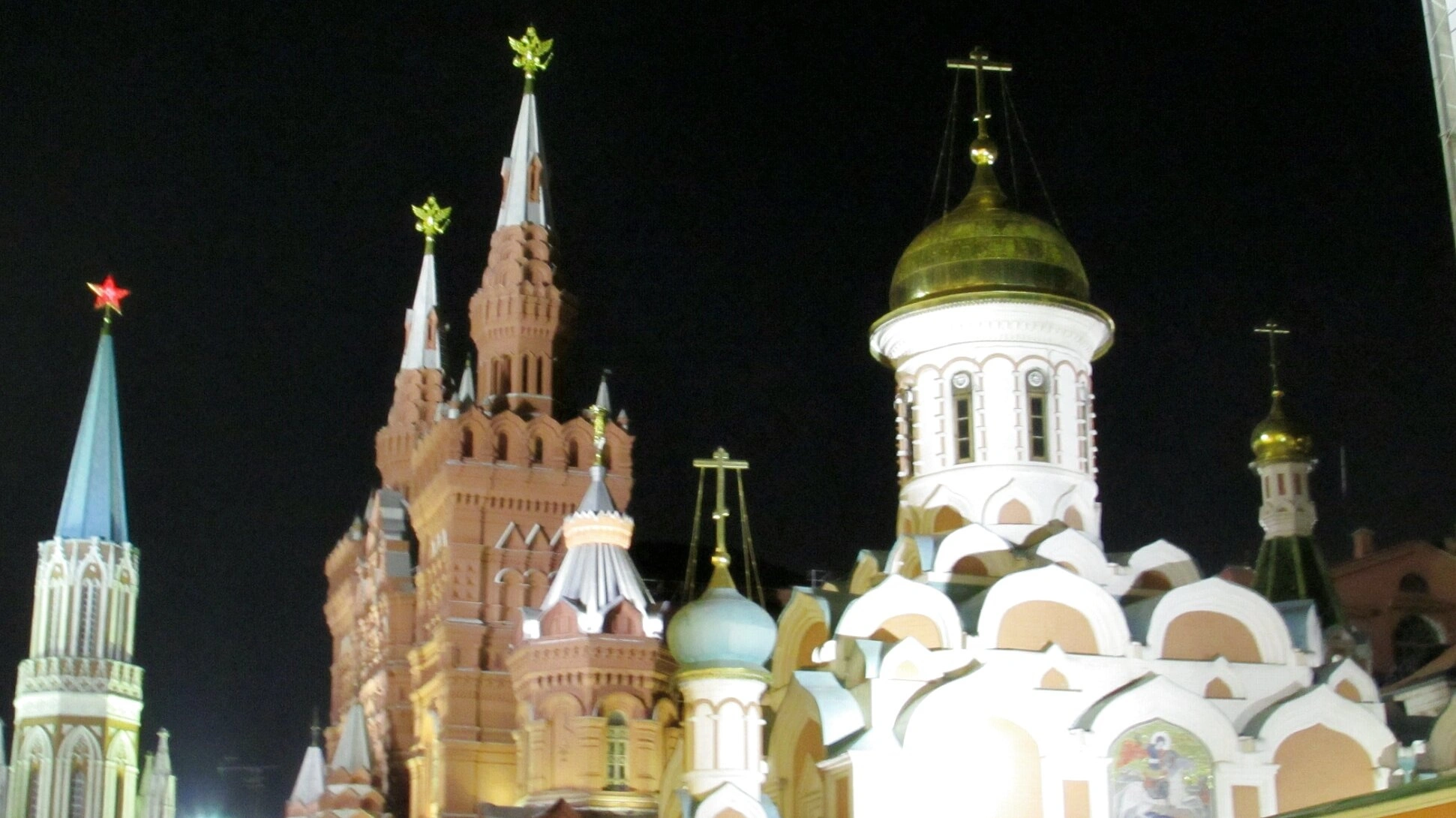 Центральным объектом изображения справа предстаёт Казанский собор — восстановленный православный храм во имя Казанской иконы Божией Матери. Белоснежные стены, украшенные рядами кокошников, венчает золочёный главный купол, под которым находится малый бирюзовый купол колокольни. Чётко видимые в лучах прожекторов кресты на куполах символизируют торжество православной веры. Собор был возведён в XVII веке в память об освобождении Москвы от польско-литовских интервентов и является не только архитектурным, но и глубоко почитаемым духовным символом.