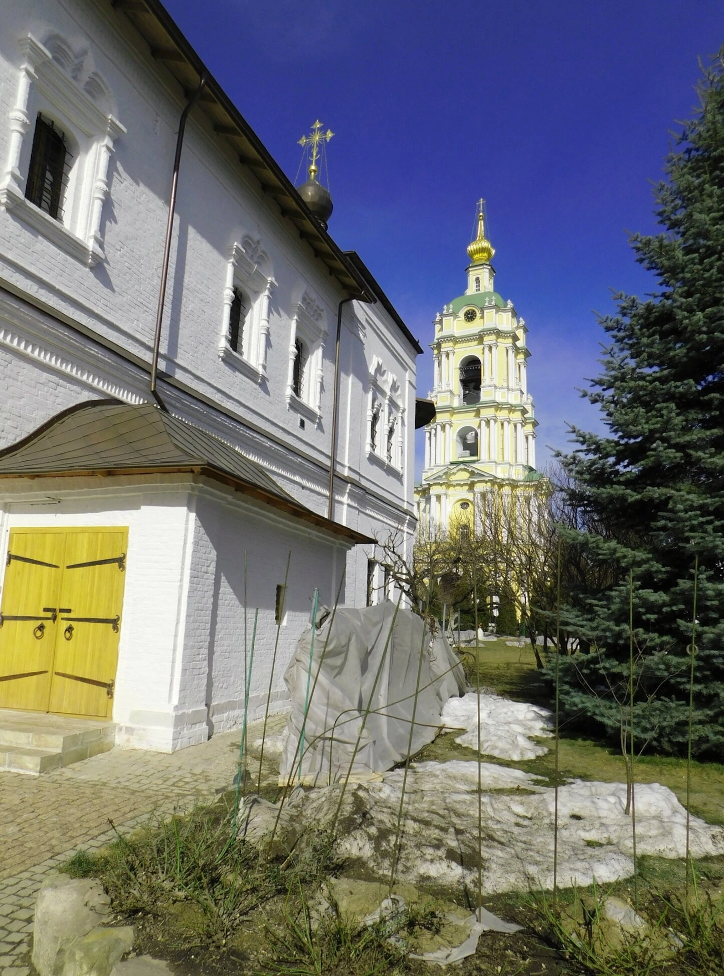 На переднем плане снимка видна монументальная колокольня монастыря, возведённая в 1759–1785 годах по проекту архитектора Ивана Жеребцова. Высота колокольни составляет более восьмидесяти метров, что делает её одной из самых высоких в Москве. Её стройный силуэт в стиле классицизма доминирует над окружающей застройкой и символизирует духовное величие обители. Слева от неё располагается фрагмент стены или здания из белого камня, характерного для традиционного московского зодчества.