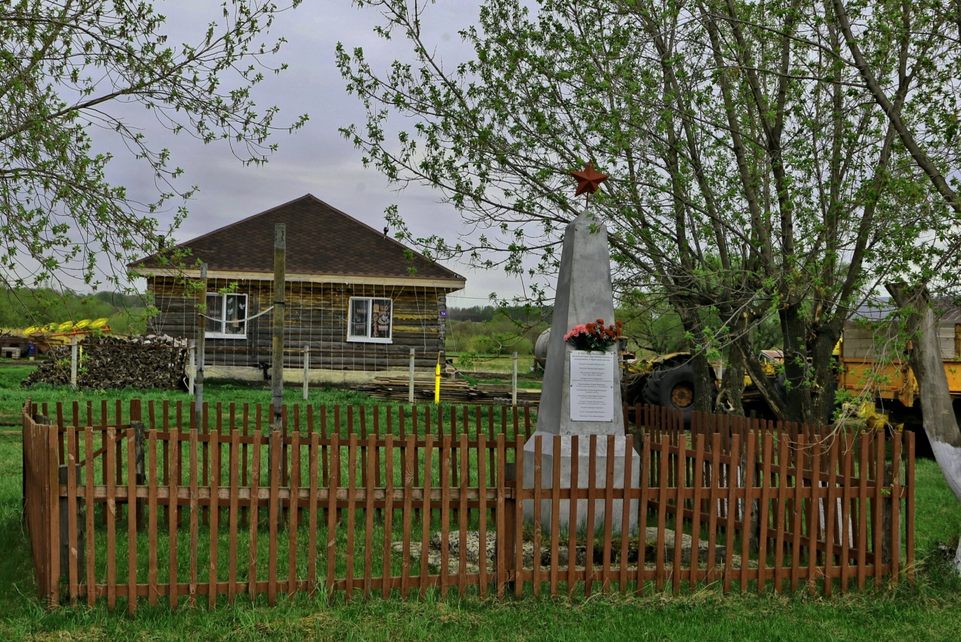 Окружающий ландшафт дополняют деревья с молодой листвой, что свидетельствует о весеннем времени года. Весь комплекс представляет собой типичный для российских деревень памятник воинам-освободителям, сохраняемый местными жителями как святыня. Подобные мемориалы являются неотъемлемой частью исторической памяти и культурного наследия Тюменской области.