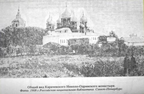 На архивной фотографии 1908 года, хранящейся в фондах Российской национальной библиотеки, запечатлён общий вид святой обители во имя святителя Николая Чудотворца — Карачевского Николо-Одринского монастыря. Монастырь, расположенный в живописной местности на берегу реки Одрины в Карачевском уезде, предстаёт в своём историческом облике конца XVIII — начала XIX столетия.