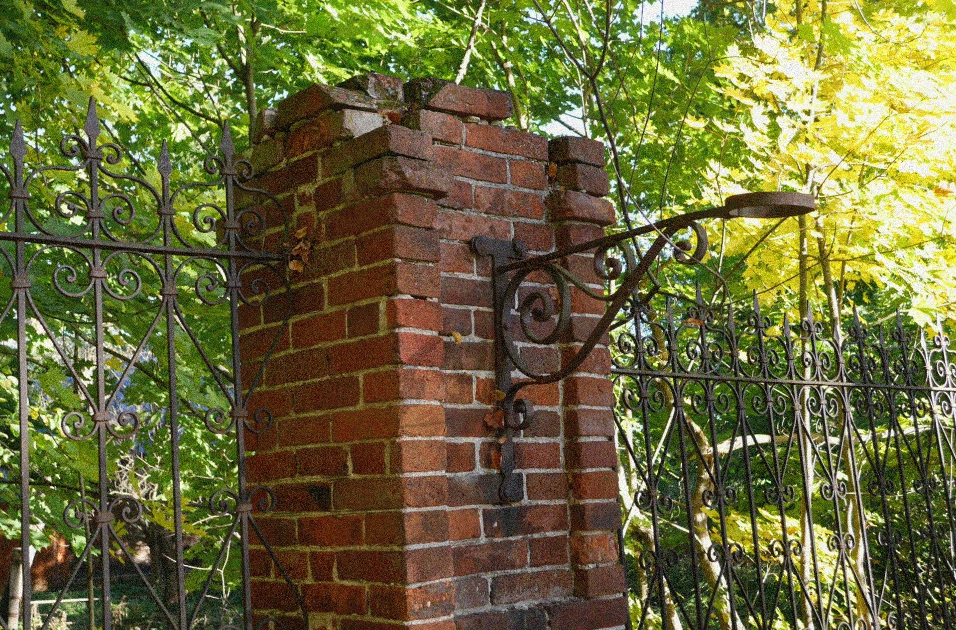 На представленной фотографии запечатлён фрагмент исторической ограды, окружающей Церковь Покрова Пресвятой Богородицы в подмосковном селе Мышенское. Центральным элементом композиции является мощный кирпичный столб, выполненный в традициях церковного зодчества и служащий опорой для ворот или калитки. К нему прикреплён изящный кованый кронштейн, который в прошлом, вероятно, поддерживал фонарь, освещавший вход на святую территорию храма.