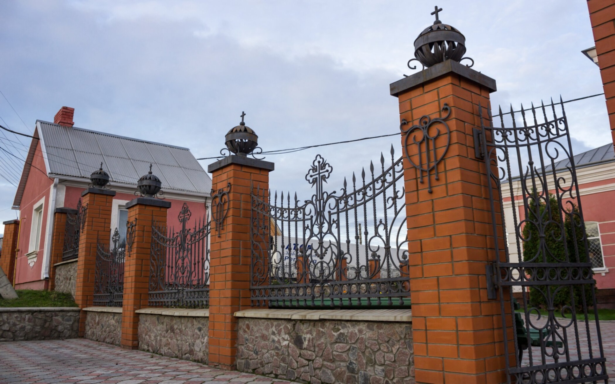 Ограда состоит из мощных кирпичных столбов, увенчанных декоративными навершиями в виде главок с восьмиконечными православными крестами, что символизирует торжество веры и устремлённость к горнему миру. Проёмы между столбами заполнены ажурными коваными секциями, в узоре которых также угадываются кресты, подчёркивающие сакральное предназначение места. Этот прочный забор не только обозначает границы церковной территории, но и служит образом ограждения мира духовного от мира суетного.