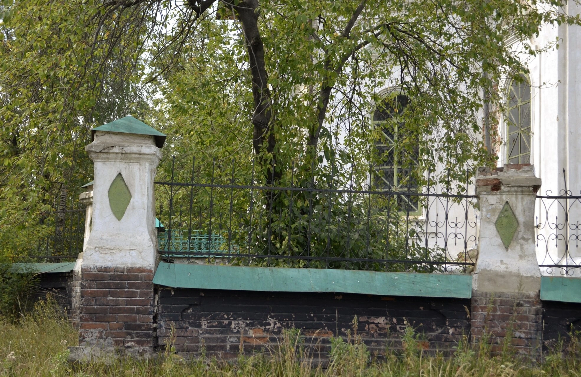 На фотографии запечатлён фрагмент исторической ограды, окружающей Храм во имя Святителя Николая Чудотворца в старинном уральском посёлке Быньги. Ограда представляет собой прекрасный образец церковного зодчества, сочетающий основательность каменной кладки, изящество художественной ковки и традиционные для православной архитектуры элементы. Каменные столбы, увенчанные зелёными шатровыми завершениями, и ажурные кованые пролёты не только обозначают границы святого места, но и создают особый, молитвенный настрой, подготавливая верующих к входу в дом Божий.