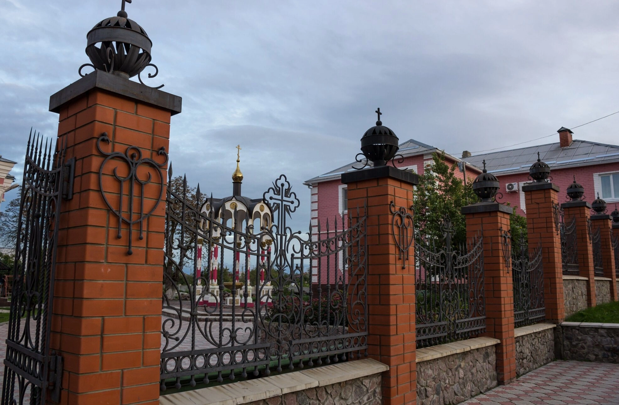 На представленной фотографии запечатлён фрагмент ограды Свято-Крестовоздвиженского храма, расположенного в слободе Ямская города Старый Оскол. На переднем плане изображены массивные кирпичные столбы, увенчанные православными восьмиконечными крестами, что является традиционным элементом оформления священных пространств. Между столбами установлена ажурная кованая ограда, выполненная с применением декоративных кованых элементов и узоров, которые не только выполняют функцию ограждения, но и служат украшением, отражая традиции кузнечного мастерства.