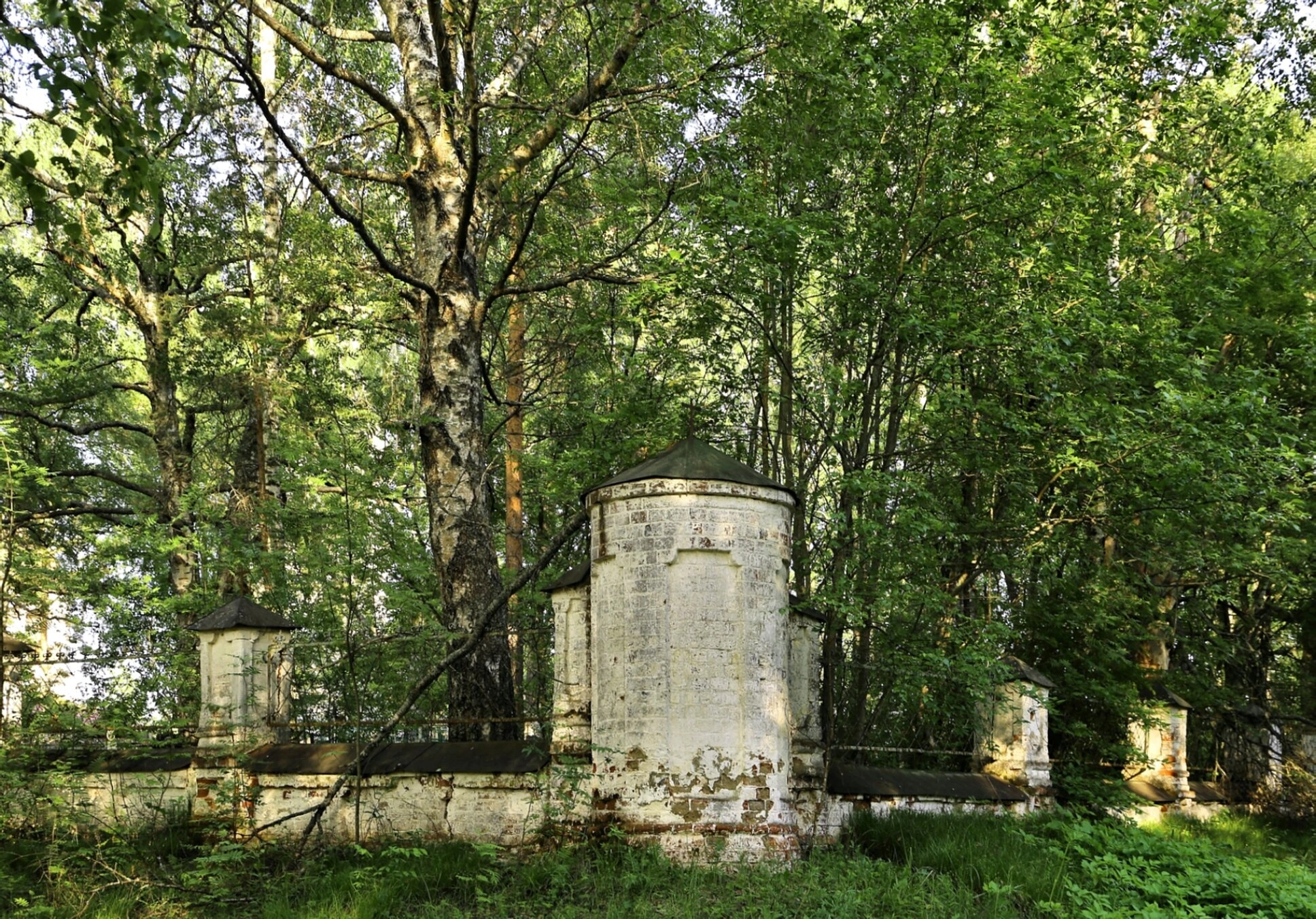 Территория погоста, заросшая деревьями и травой, вызывает чувство благоговейной грусти, напоминая о бренности земного бытия. Фотография передаёт атмосферу забвения и одновременно духовной стойкости православной святыни, продолжающей нести своё свидетельство сквозь века.