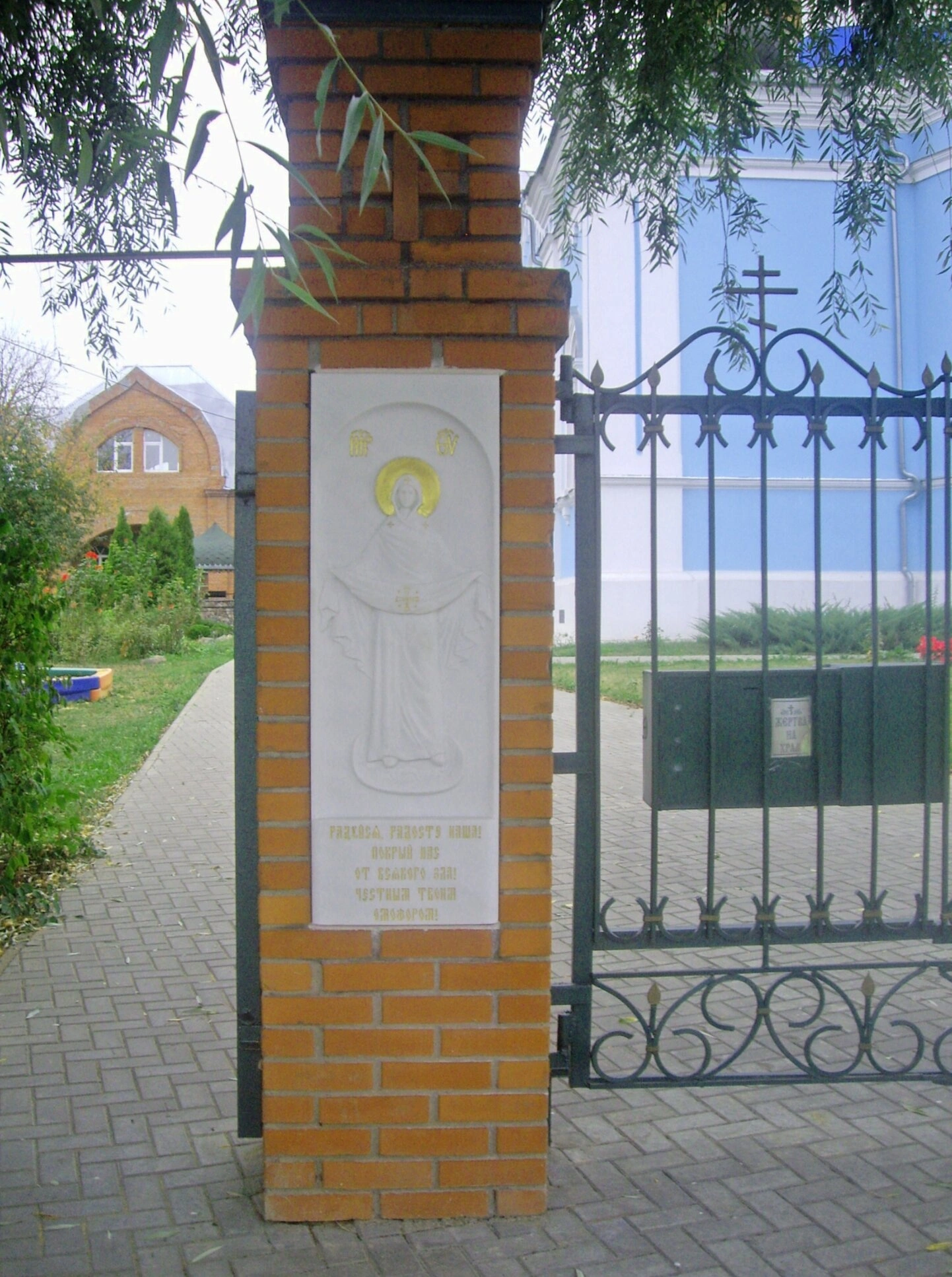 На представленной фотографии запечатлён фрагмент кирпичной ограды территории Покровского храма в селе Карпово. К мощному столбу из красного кирпича прикреплена светлая каменная табличка, на которой высечено священное изображение. Икона представляет собой образ святого в традиционном нимбе, что свидетельствует о его святости и благочестии. Данный элемент ограды выполняет не только защитную, но и духовную функцию, освящая границы храмовой земли и благословляя всех входящих.
