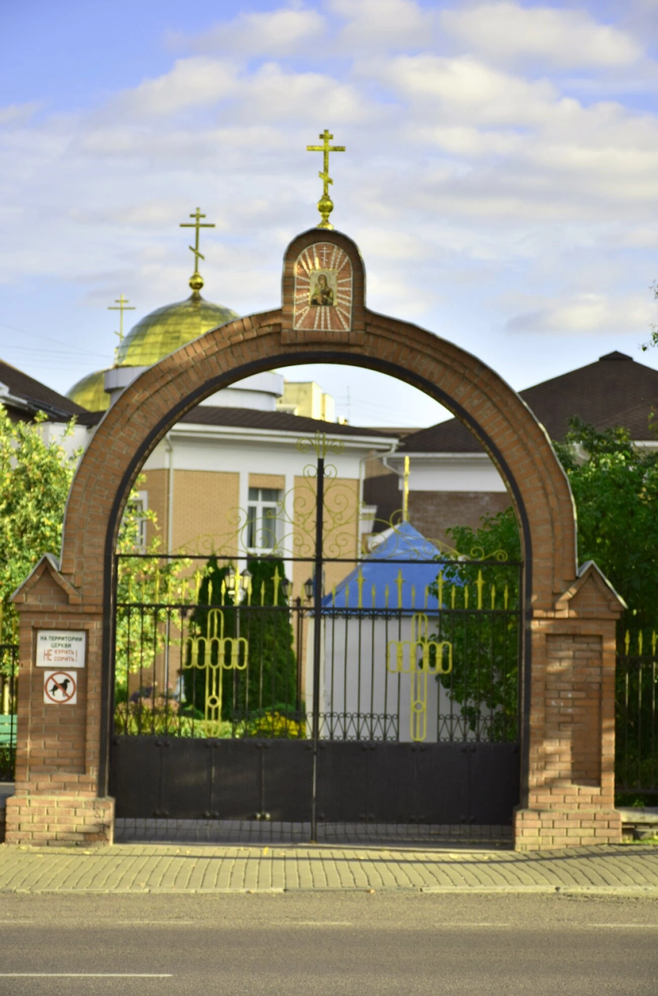 Центральным элементом композиции является монументальная арка, сложенная из красного кирпича. В арочном проеме установлены кованые металлические ворота черного цвета, украшенные золочеными декоративными элементами. Над аркой возвышается небольшой купол, увенчанный православным крестом, а под сенью арки помещено изображение иконы. По обе стороны от ворот расположены массивные кирпичные столбы, завершающиеся декоративными элементами, которые подчеркивают значимость входа.