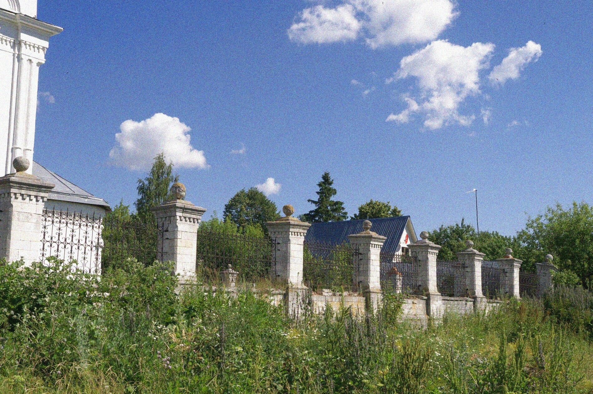 На фотографии запечатлена монументальная каменная ограда со святыми вратами, окружающая храм Казанской иконы Божией Матери в селе Киясово. Массивные столбы из белого камня, увенчанные декоративными элементами, и ажурные кованые решётки ворот создают величественный и завершённый образ церковной территории, отделяя её от мирской суеты и обозначая особое, освящённое пространство.