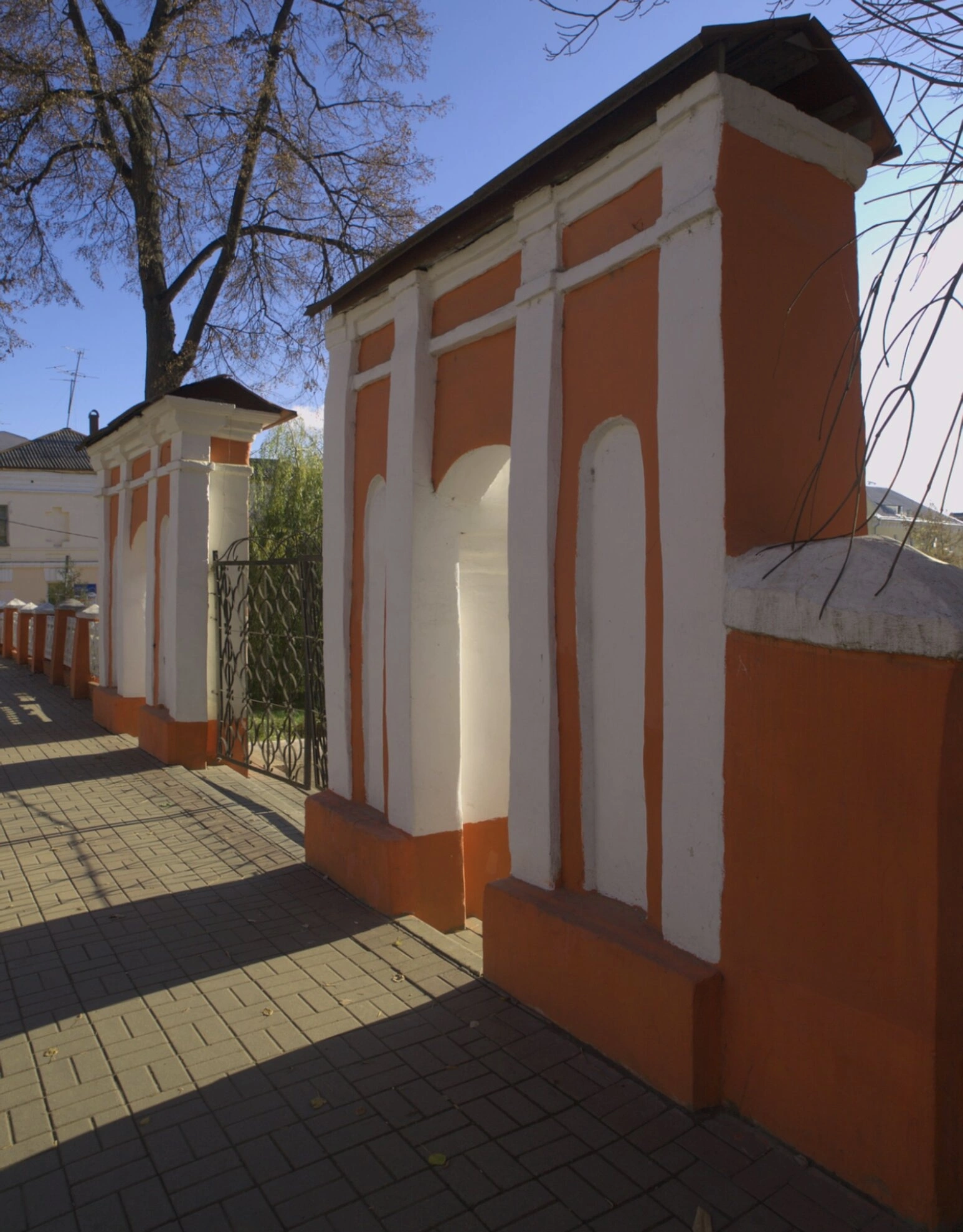 В архитектурном решении ограды прослеживаются элементы русского церковного зодчества. Массивные столбы из красного кирпича увенчаны небольшими покрытиями, напоминающими монастырские кровли. Между столбами расположены арочные проемы, в одном из которых установлена кованая металлическая калитка с ажурным узором, характерным для православных храмовых ограждений.