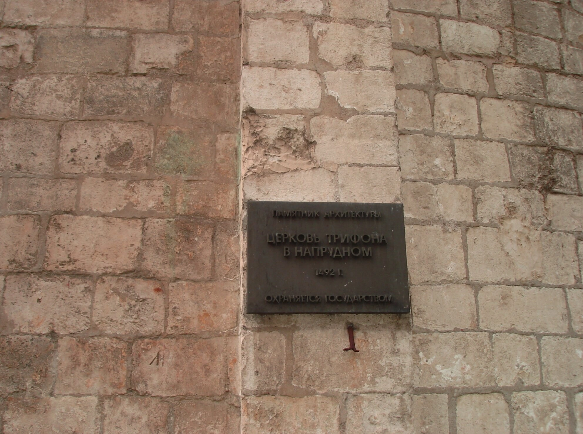 Чётко читаемый текст на табличке гласит: «ПАМЯТНИК АРХИТЕКТУРЫ ЦЕРКОВЬ ТРИФОНА В НАПРУДНОМ» и указывает год её постройки — 1492 год от Рождества Христова. Указание года подчёркивает исключительную историческую ценность этого святого места, пережившего века.