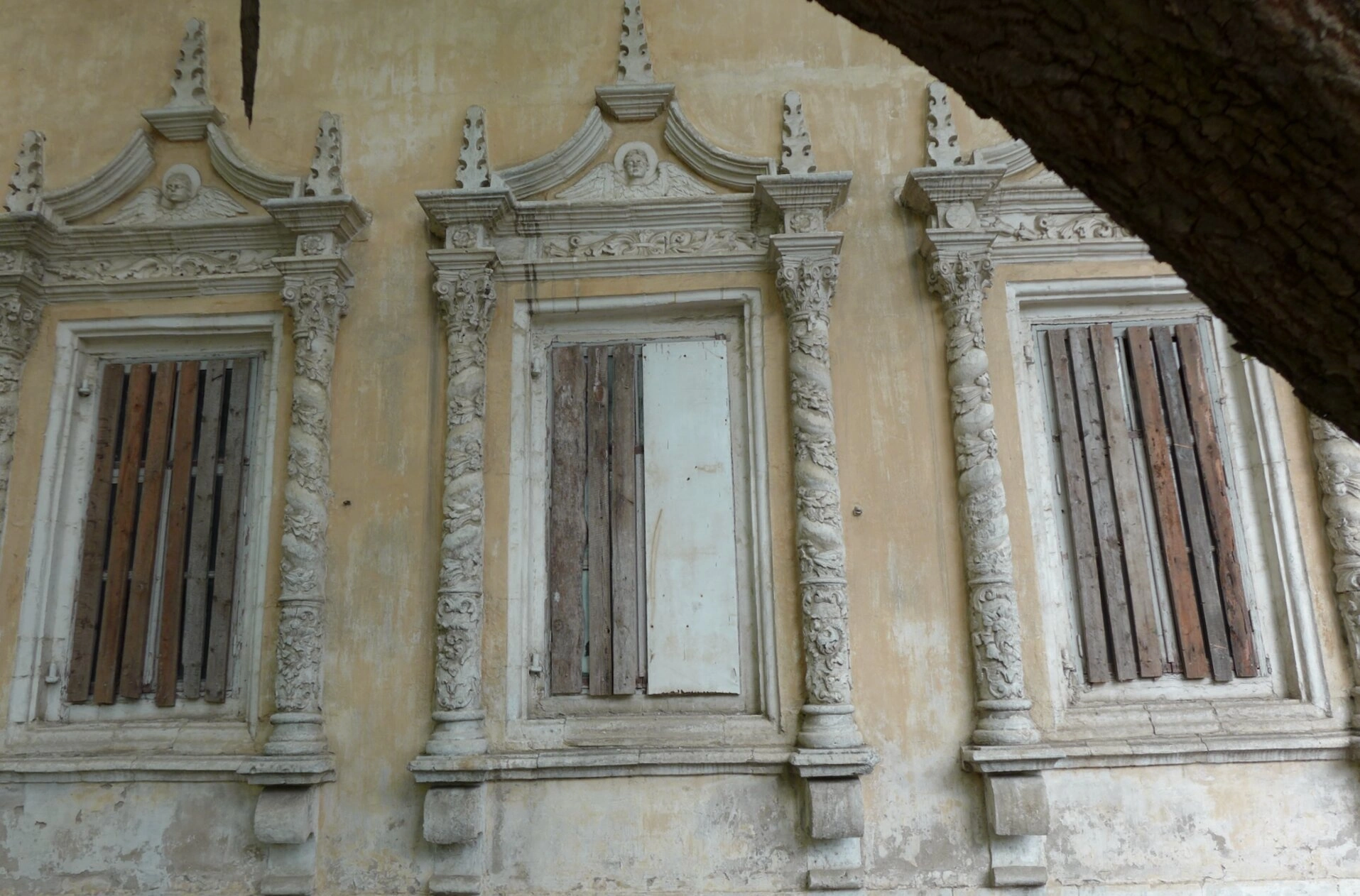 На представленном фотографическом снимке запечатлён фрагмент фасада старинного православного храма – Церкви Святой Троицы, что в городе Твери, также известной в народе как Белая Троица. В объектив фотографа попали три оконных проёма, расположенных на одном из ярусов колокольни или самого здания церкви. Окна обильно украшены пышным лепным декором в барочном стиле, характерном для русского церковного зодчества более поздних периодов. Наличники окон оформлены пилястрами и колоннами, несущими на себе элементы ордера, что придаёт всей композиции величие и строгость, несмотря на запустение.