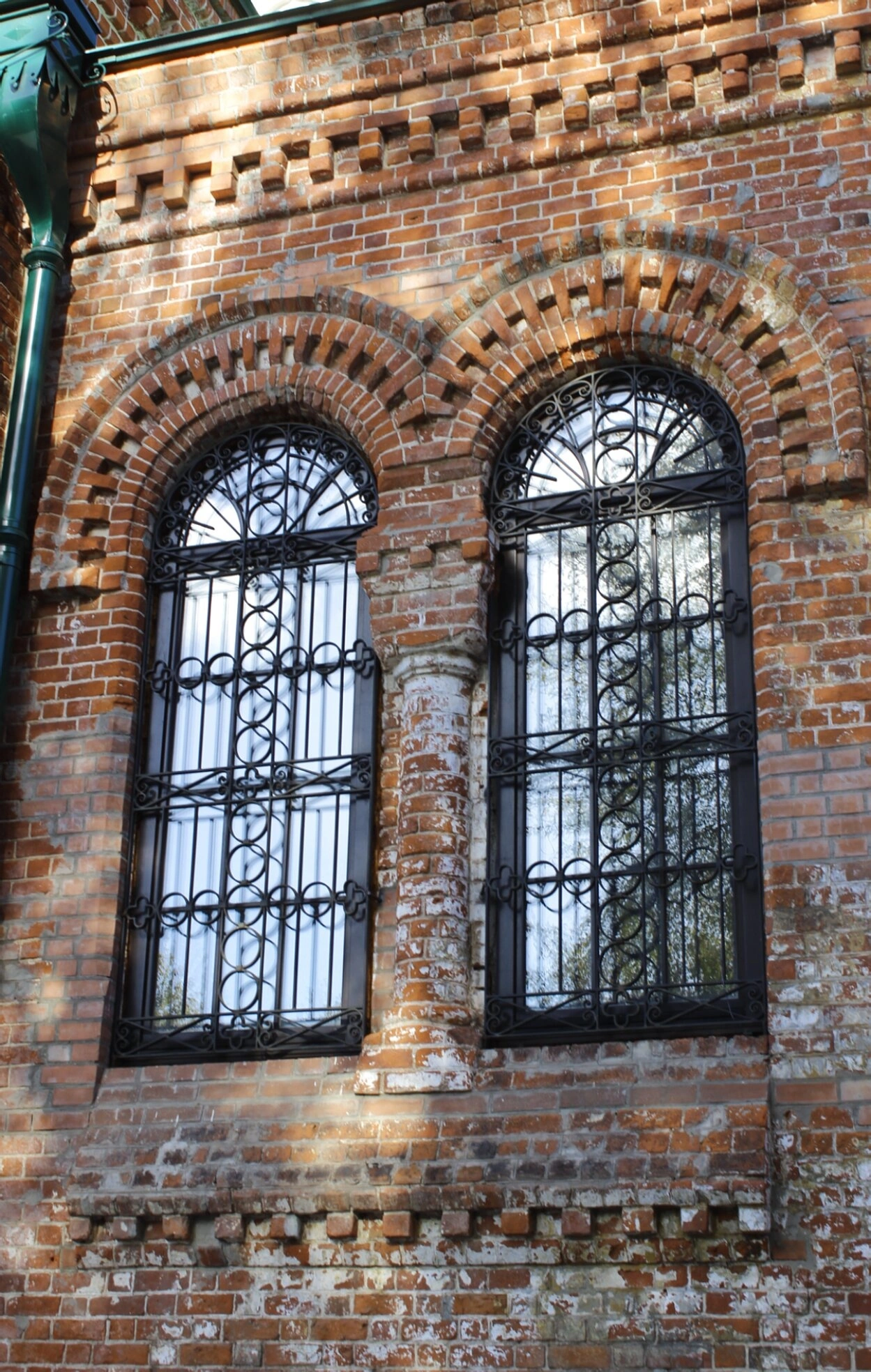 Кирпичная кладка вокруг окон выполнена с высочайшим мастерством и служит образцом «кирпичного стиля». Декоративные элементы из фигурного красного кирпича искусно подчёркивают форму каждого окна, создавая сложный и благородный архитектурный рисунок. Особого внимания заслуживают ажурные кованые решётки, установленные в проёмах. Их узор, составленный из округлых и спиралевидных элементов, не только выполняет защитную функцию, но и является самостоятельным произведением кузнечного искусства, символизируя небесную красоту горнего мира.