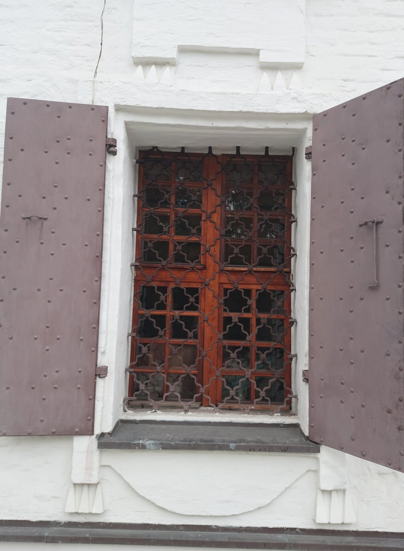 Окно Церкви Николая Чудотворца в Голутвине с металлическими ставнями и решеткой